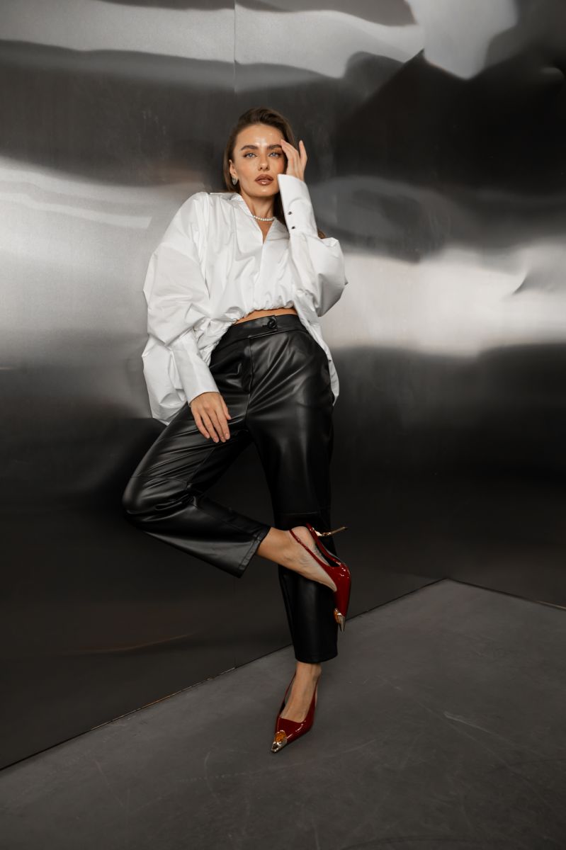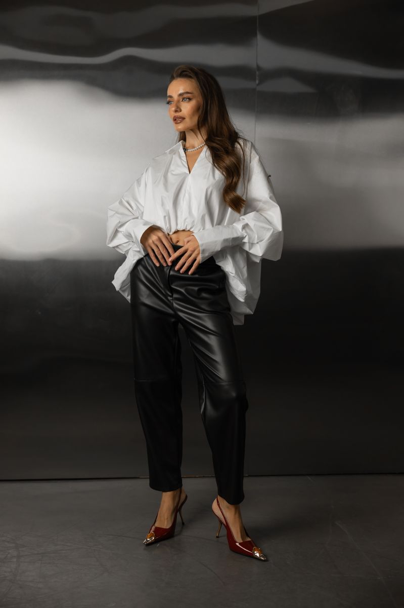 Ця біла сорочка — базовий елемент гардероба, який поєднує в собі елегантність і комфорт. Вільний фасон, подовжені рукави та глибокий виріз формують сучасний образ, що підходить як для повсякденного стилю, так і для офісу чи виходу. Сорочка красиво лягає на фігуру та легко комбінується з будь-яким низом — джинсами, спідницями чи штанами з екошкіри.