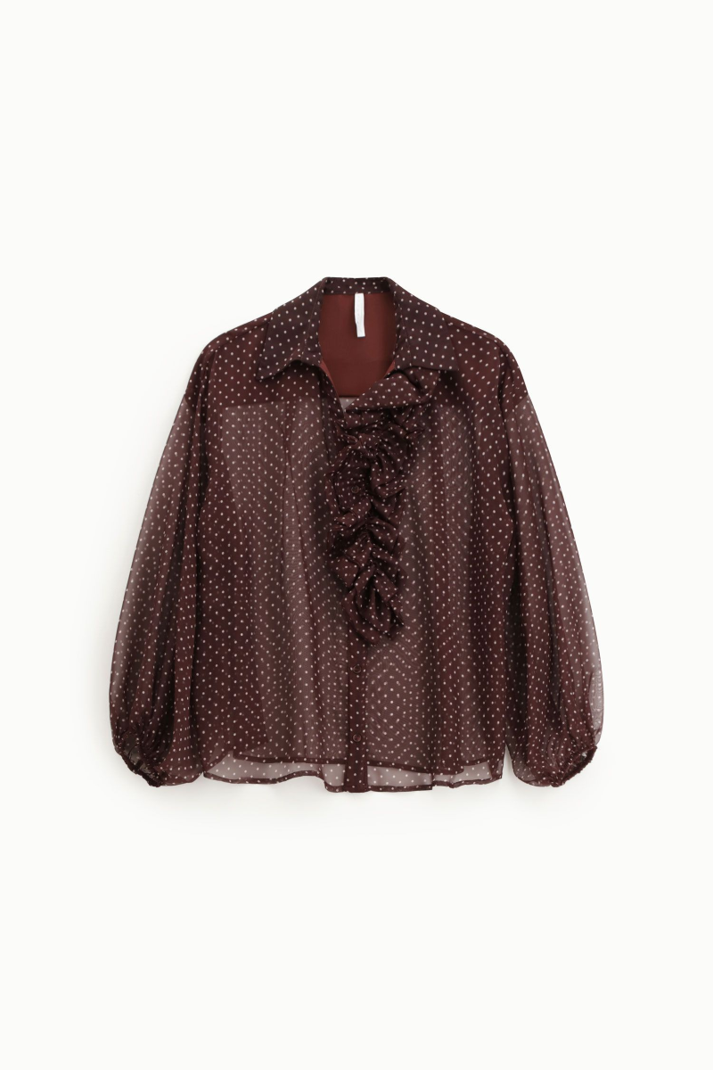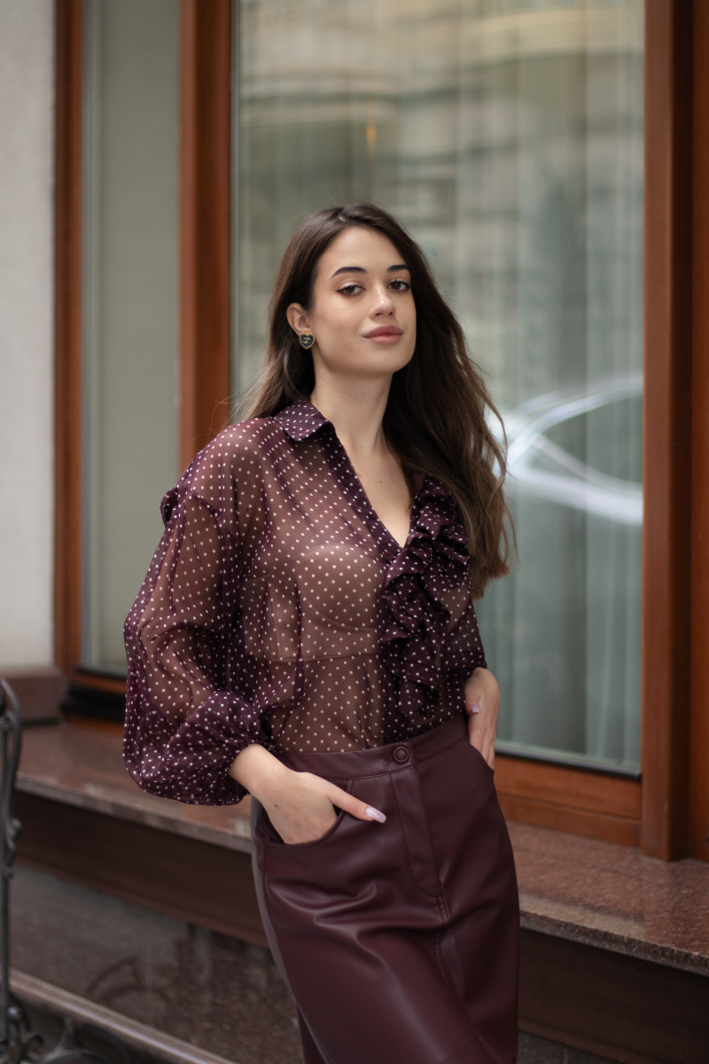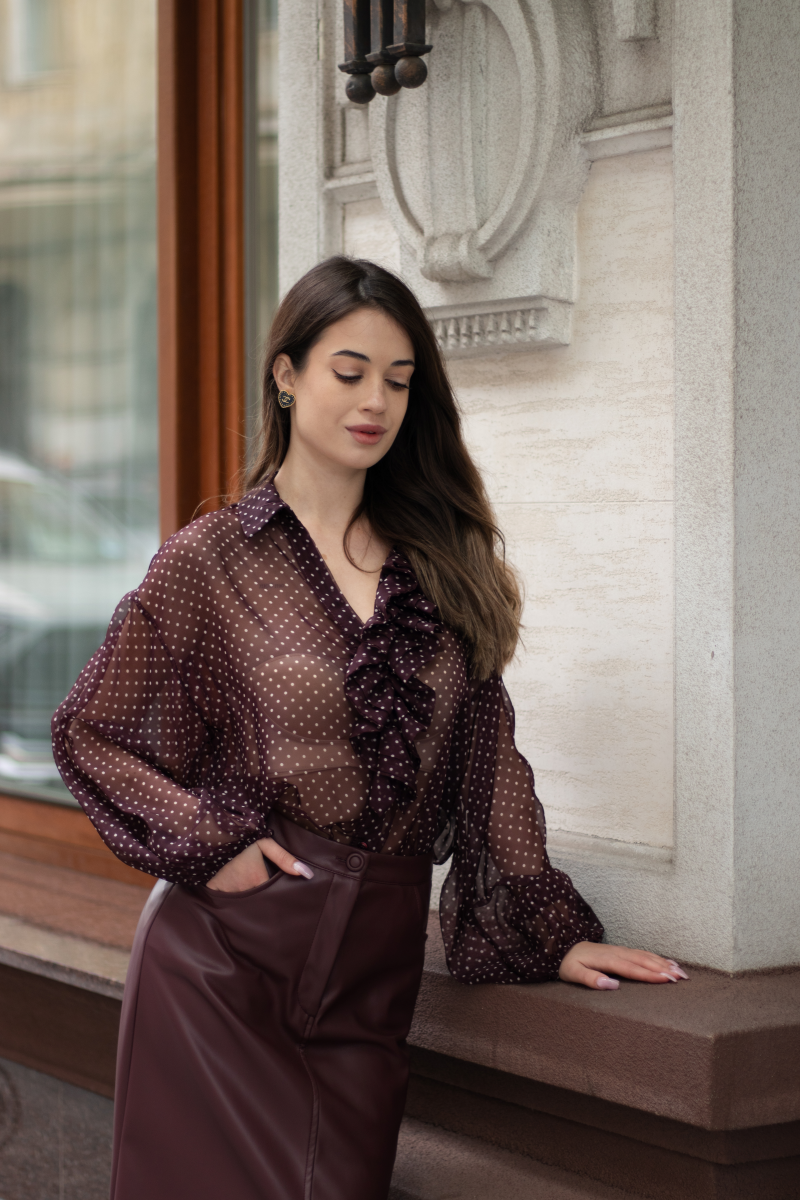 Прозора шифонова блузка з гороховим принтом і декоративним воланом спереду.
