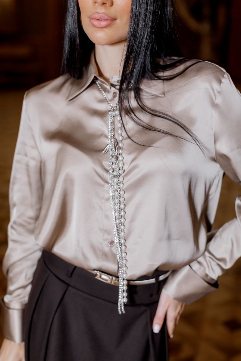Блуза виконана з гладкої, приємної на дотик тканини з шовковим ефектом. Модель має прямий крій, довгий рукав, класичний комір-стійку та застібається на гудзики спереду. Особливу увагу привертає розкішний декоративний ланцюг, який додає образу вишуканості та шику.