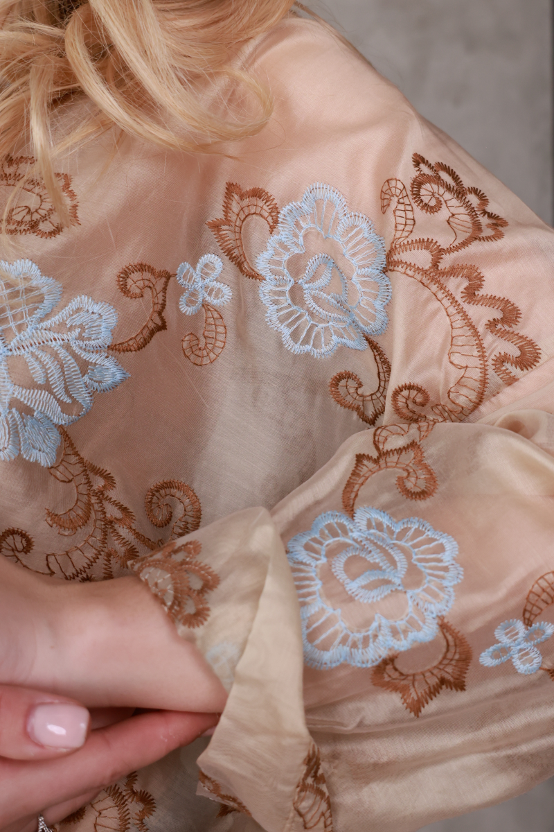 Напівпрозора текстура тканини додає легкості, а м’яка кольорова гама виглядає елегантно й ненав’язливо.