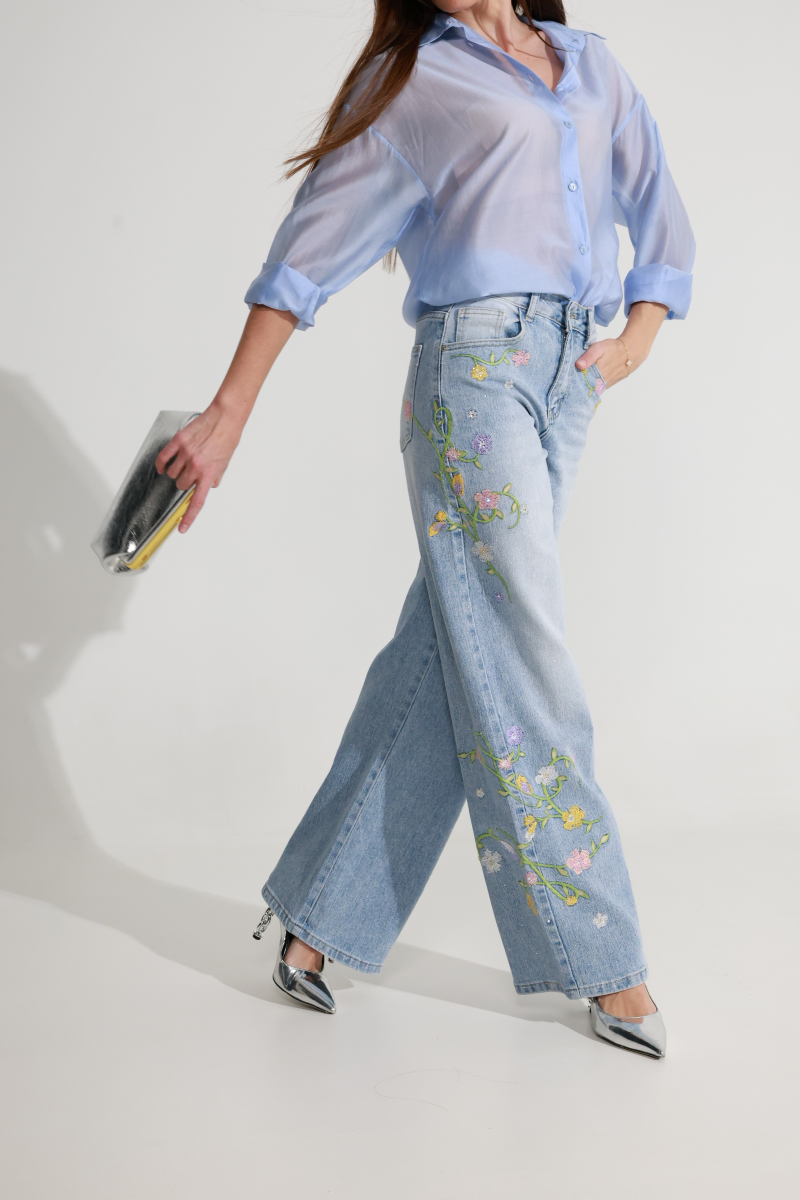 Світлі джинси wide leg з високою посадкою та витонченою квітковою вишивкою по всій довжині штанини.