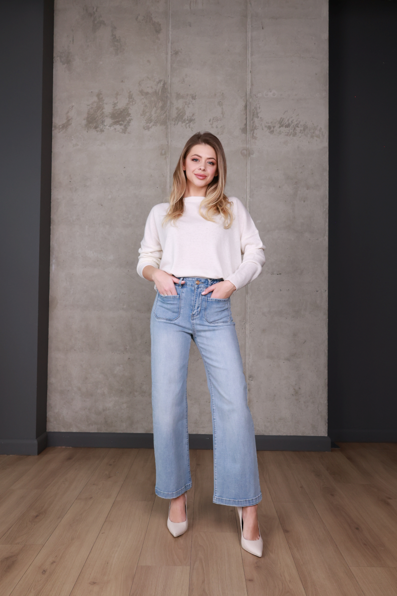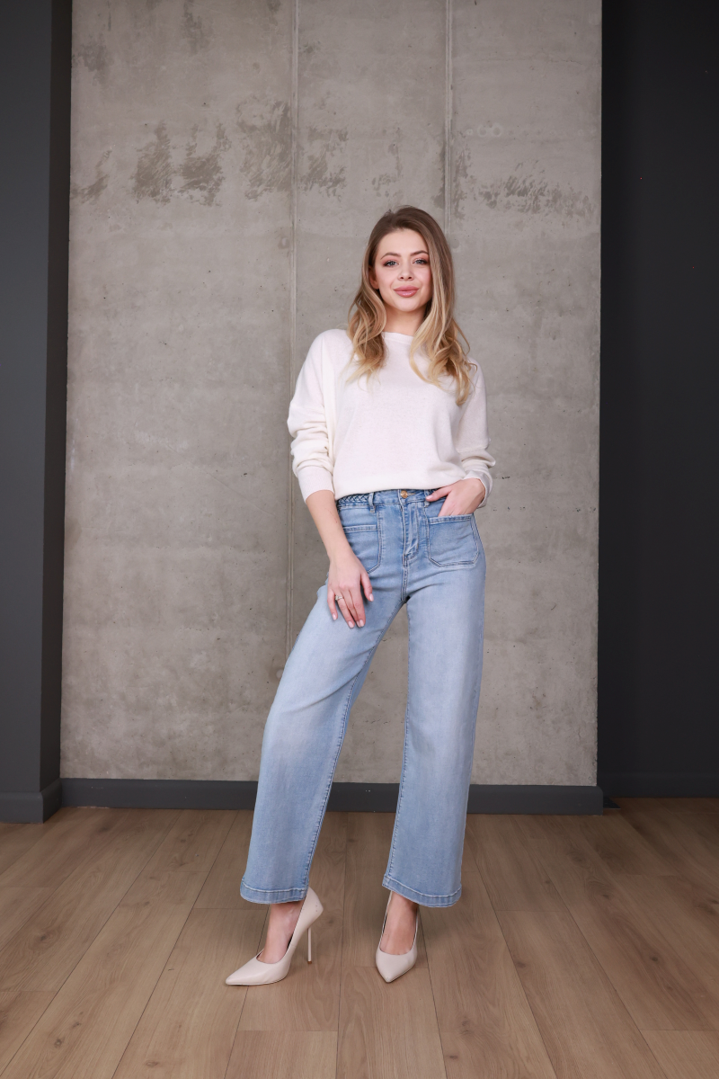 Світлий відтінок деніму легко поєднується як з базовими светрами та сорочками, так і з більш акцентними образами.