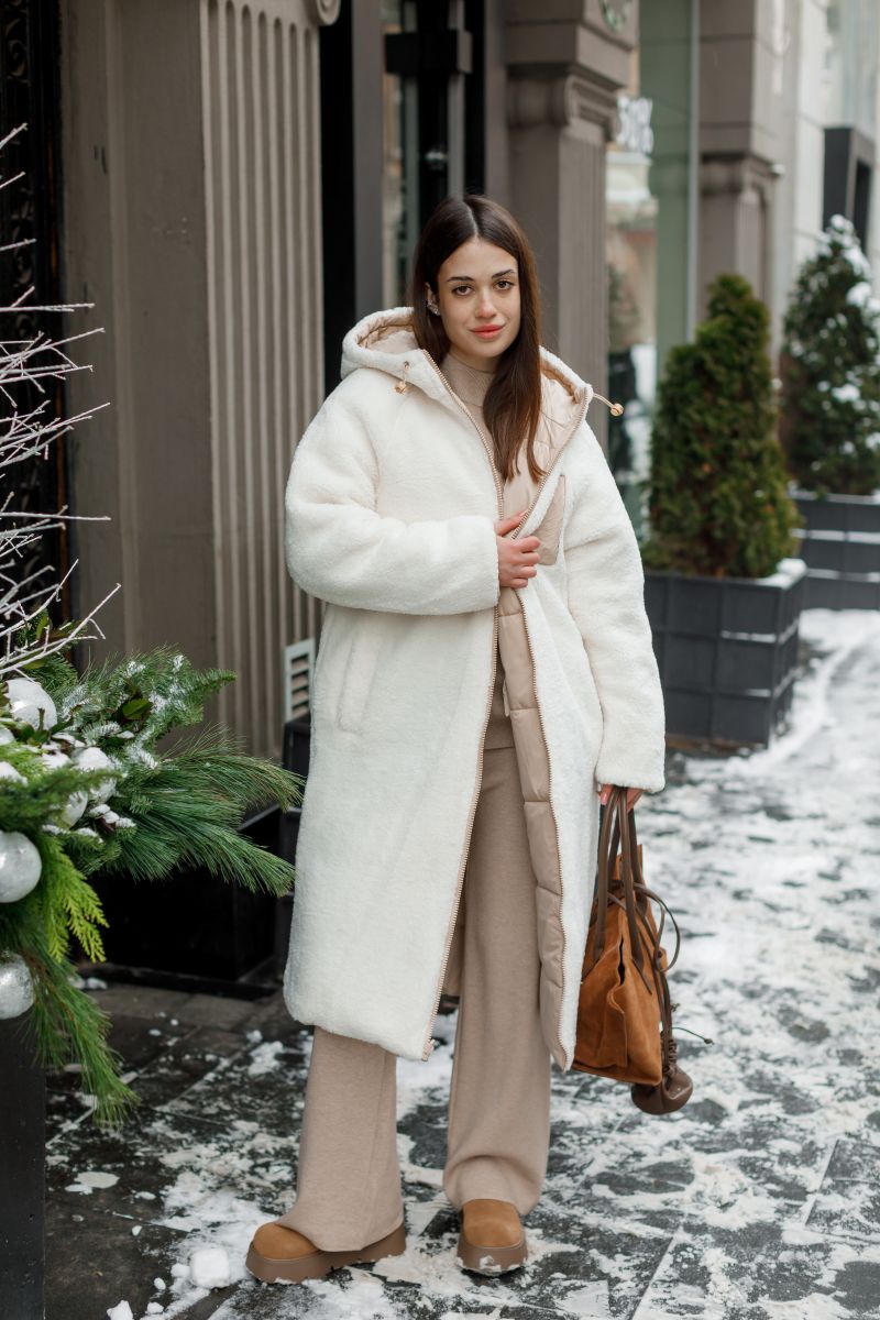 Двосторонній дизайн дозволяє змінювати вигляд залежно від настрою та погодних умов: одна сторона виконана з утепленого стьобаного матеріалу у світлому бежевому відтінку, інша — з м’якої teddy-фактури білого кольору, яка створює ефект затишку та тепла.