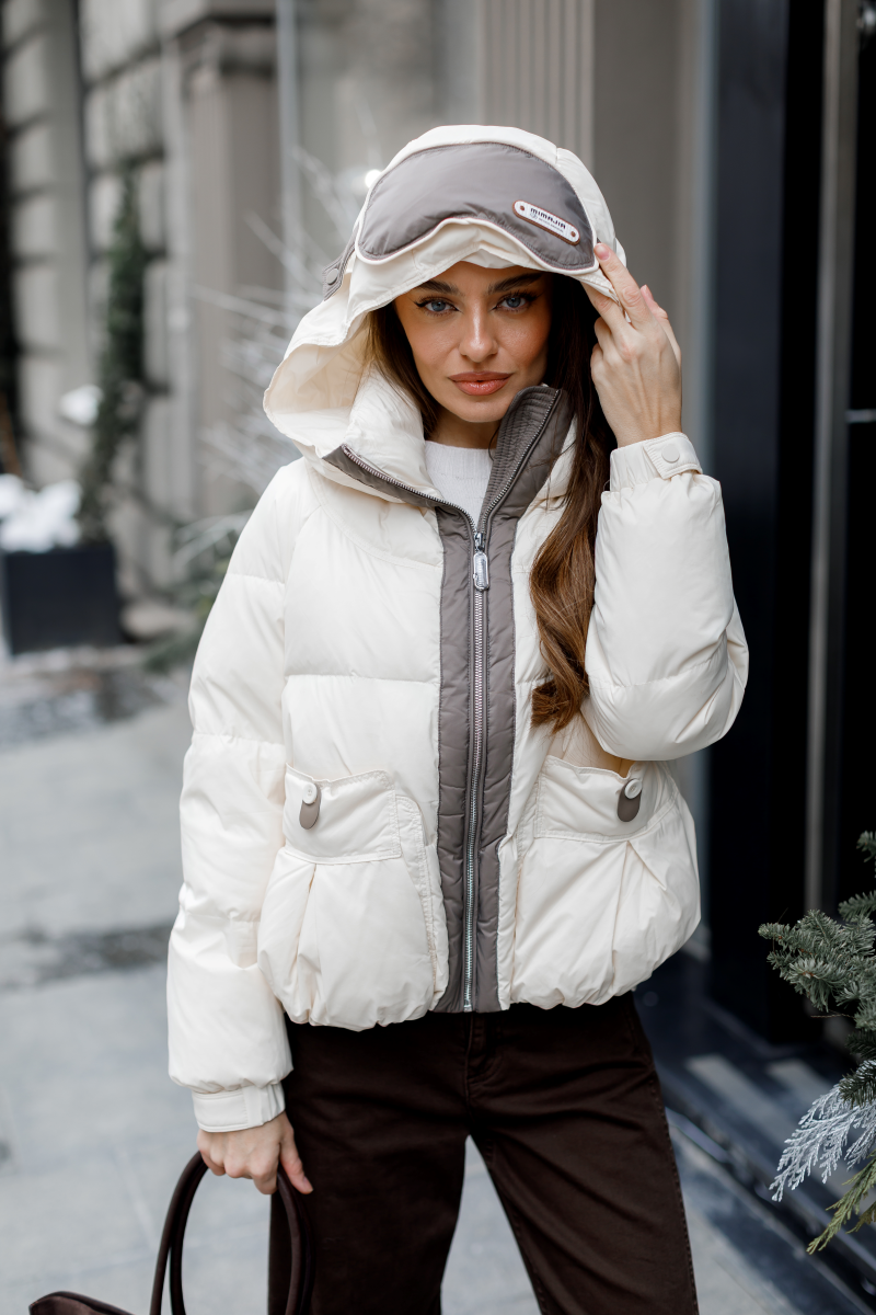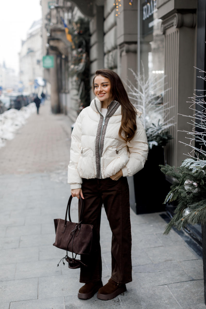 Елегантна жіноча куртка з натуральним пуховим наповненням поєднує практичність і витончений міський стиль.