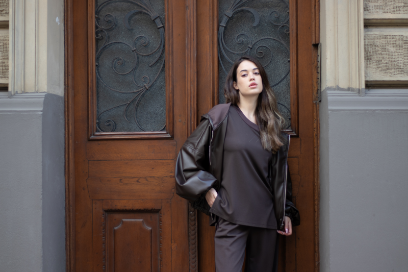 Стильна укорочена куртка з гладкої екошкіри з ефектом soft-touch. Модель має об'ємні рукави на резинці, капюшон із зав'язками та зручну блискавку по центру. Широка резинка на поясі додає силуету чіткості, підкреслюючи талію. Внутрішня підкладка приємна до тіла та забезпечує комфорт у прохолодну погоду.