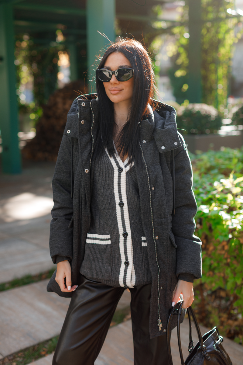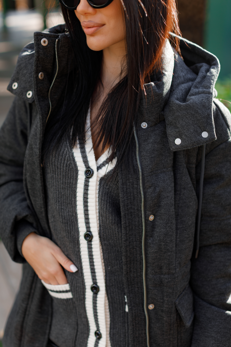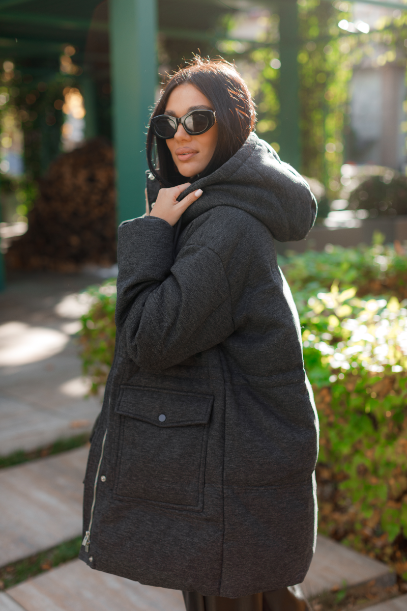 Дизайн: Мінімалістичний фасон з акцентом на лаконічні деталі. Великі накладні кишені з клапанами, висока горловина та об’ємний капюшон на шнурках.