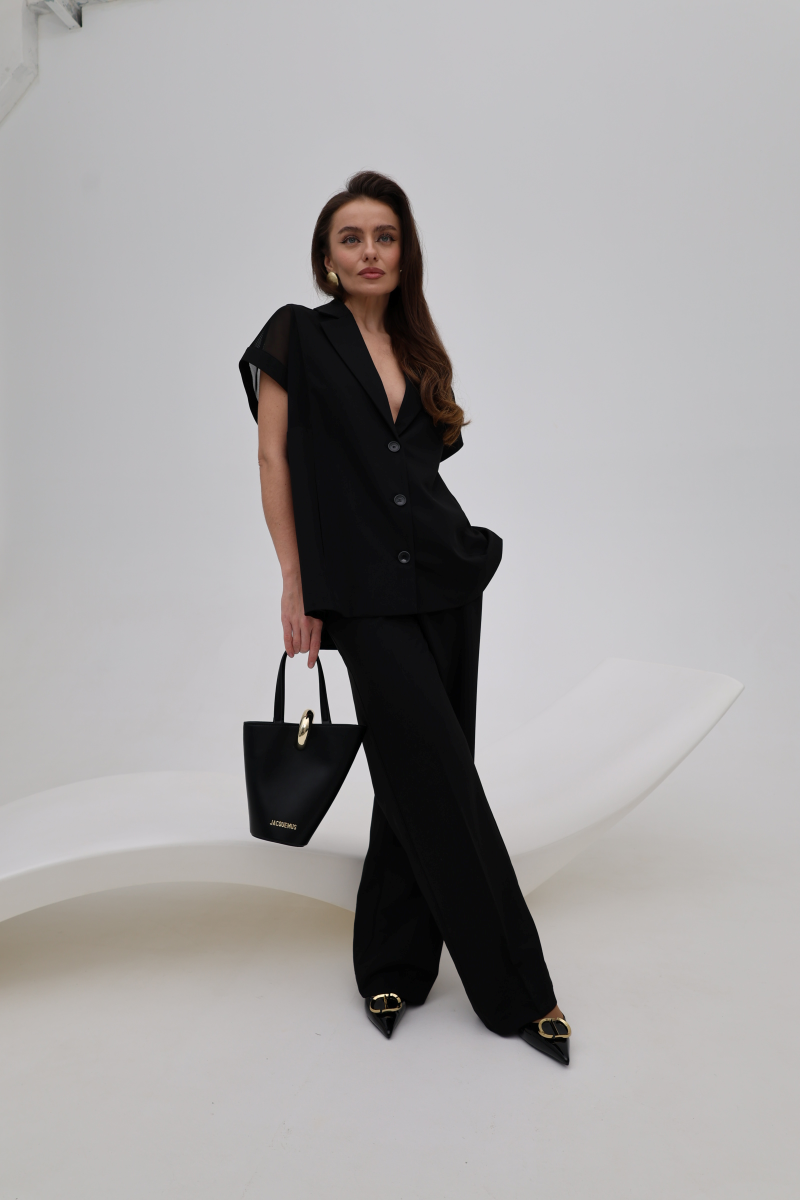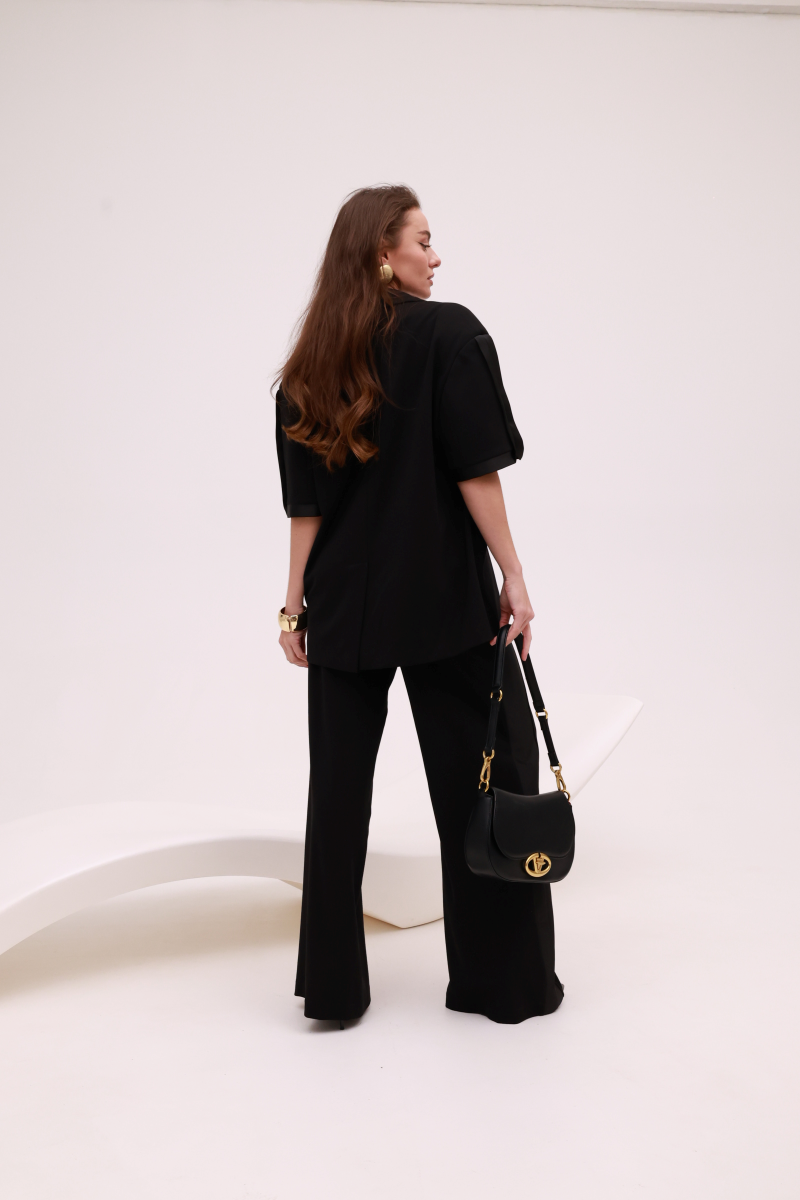Елегантні чорні штани Imperial з делікатними сатиновими вставками — сучасна інтерпретація класики з акцентом на лаконічну розкіш. М’яка, приємна до тіла тканина красиво лягає по фігурі, а сатинові деталі додають образу глибини та витонченого блиску. Вільний, подовжений силует візуально витягує силует і забезпечує комфорт у русі, що робить модель універсальною як для денних образів, так і для вечірніх виходів. Ці штани легко поєднуються з жакетами, топами чи блузами, створюючи стильний і впевнений образ у дусі сучасної італійської естетики.