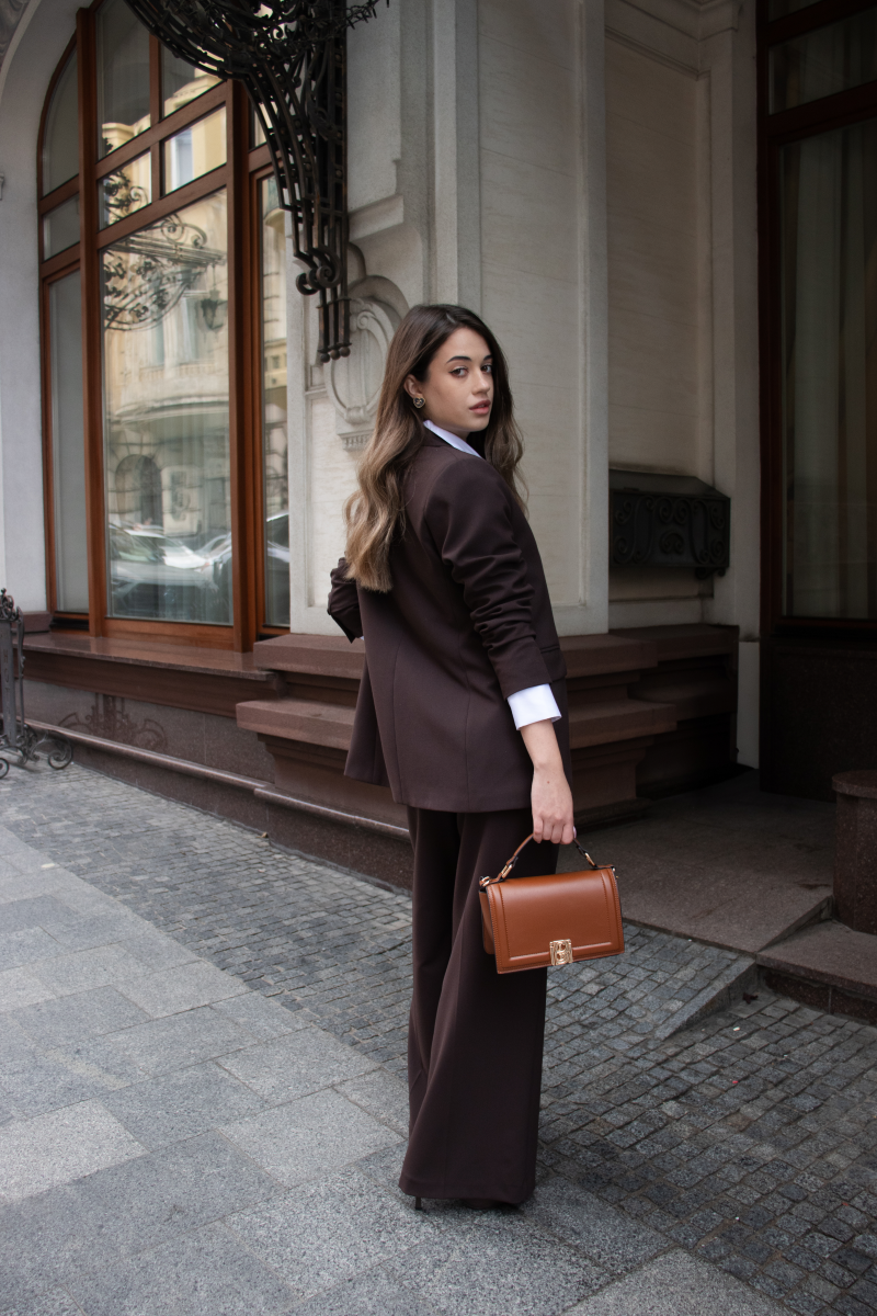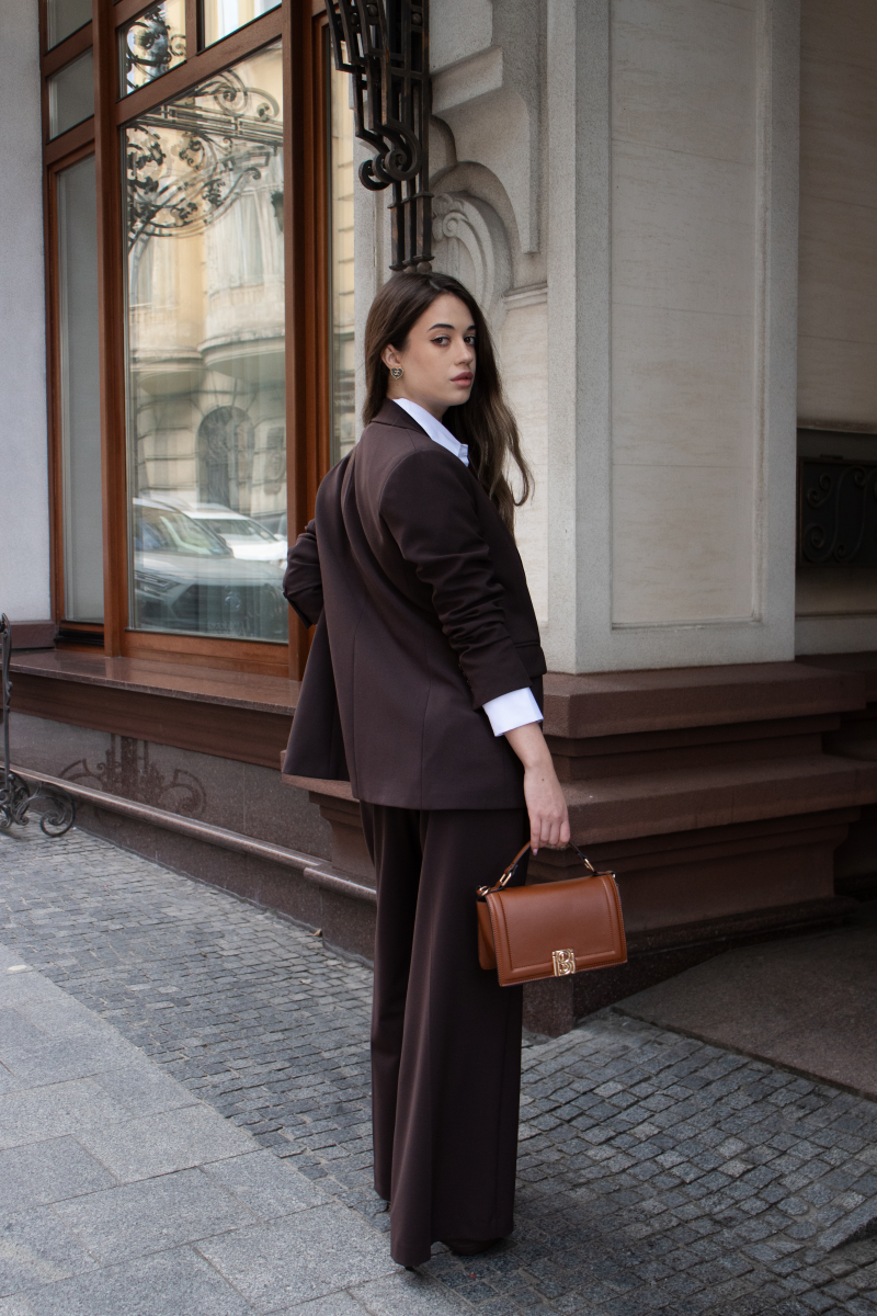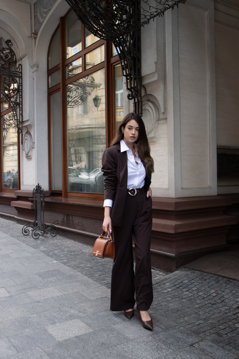 Штани палаццо з високою посадкою та декоративним ременем, виготовлені з м’якої костюмної тканини.