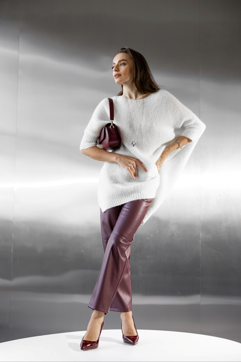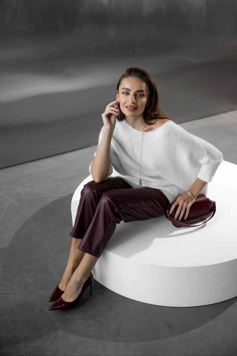 Ці штани поєднують у собі елегантність та комфорт. Виготовлені з м’якої преміальної екошкіри, вони гарно сідають по фігурі, створюючи витончений силует. Модель з високою посадкою та класичним прямим кроєм підходить як для ділових, так і для повсякденних образів. Застібка на гудзик і блискавку забезпечує зручність, а благородний бордовий відтінок додає вишуканості.