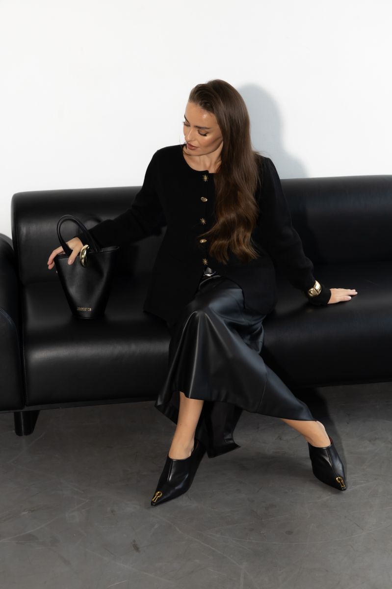 Елегантна чорна спідниця довжини міді від відомого італійського бренду IMPERIAL. Виготовлена з високоякісної екошкіри, яка приємна на дотик і стійка до зношування. Має зручну посадку на талії, акуратний пояс із ґудзиком, передній розріз додає легкості образу та дозволяє зручно рухатись. Ідеальний вибір як для ділового, так і для вечірнього стилю.
