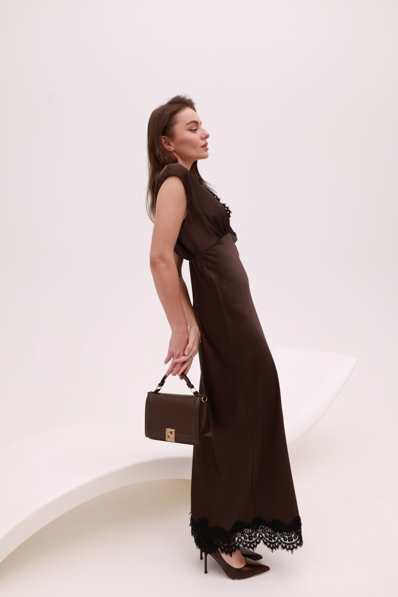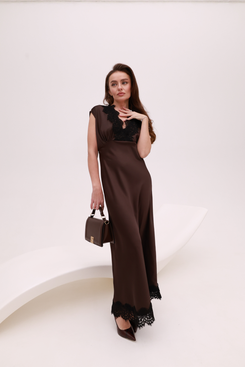 Глибокий, насичений відтінок шоколаду підкреслює благородство силуету, а делікатні мереживні акценти додають образу драматичної елегантності.