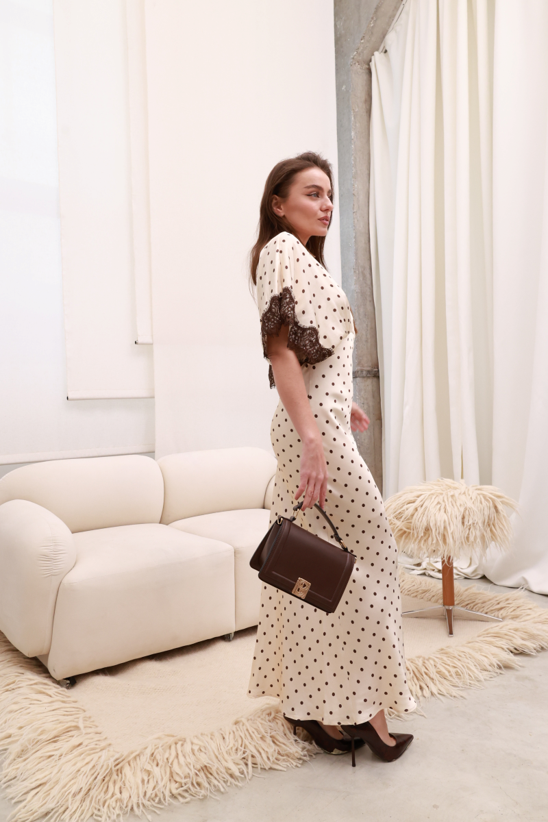 Легка, струмлива тканина делікатно підкреслює силует, а дрібний горошок створює відчуття позачасової елегантності.