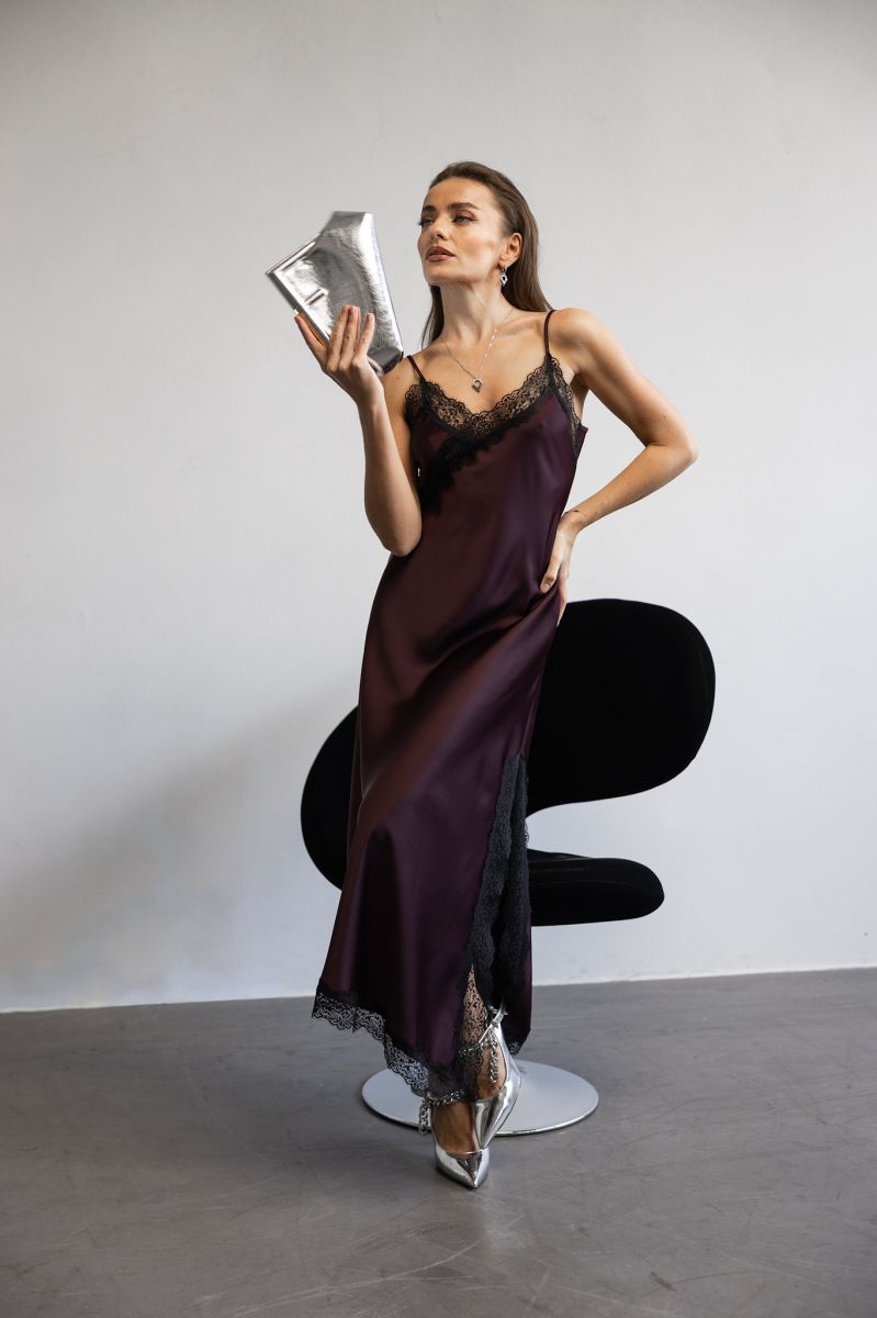 Легка, струмлива сукня-комбінація кольору глибокого бордо від італійського бренду IMPERIAL — це втілення мінімалізму та жіночності. Виконана в стилі sleep dress, вона підкреслює витончену лінію тіла завдяки м’якому сатиновому блиску та делікатному мереживу по декольте та подолу.