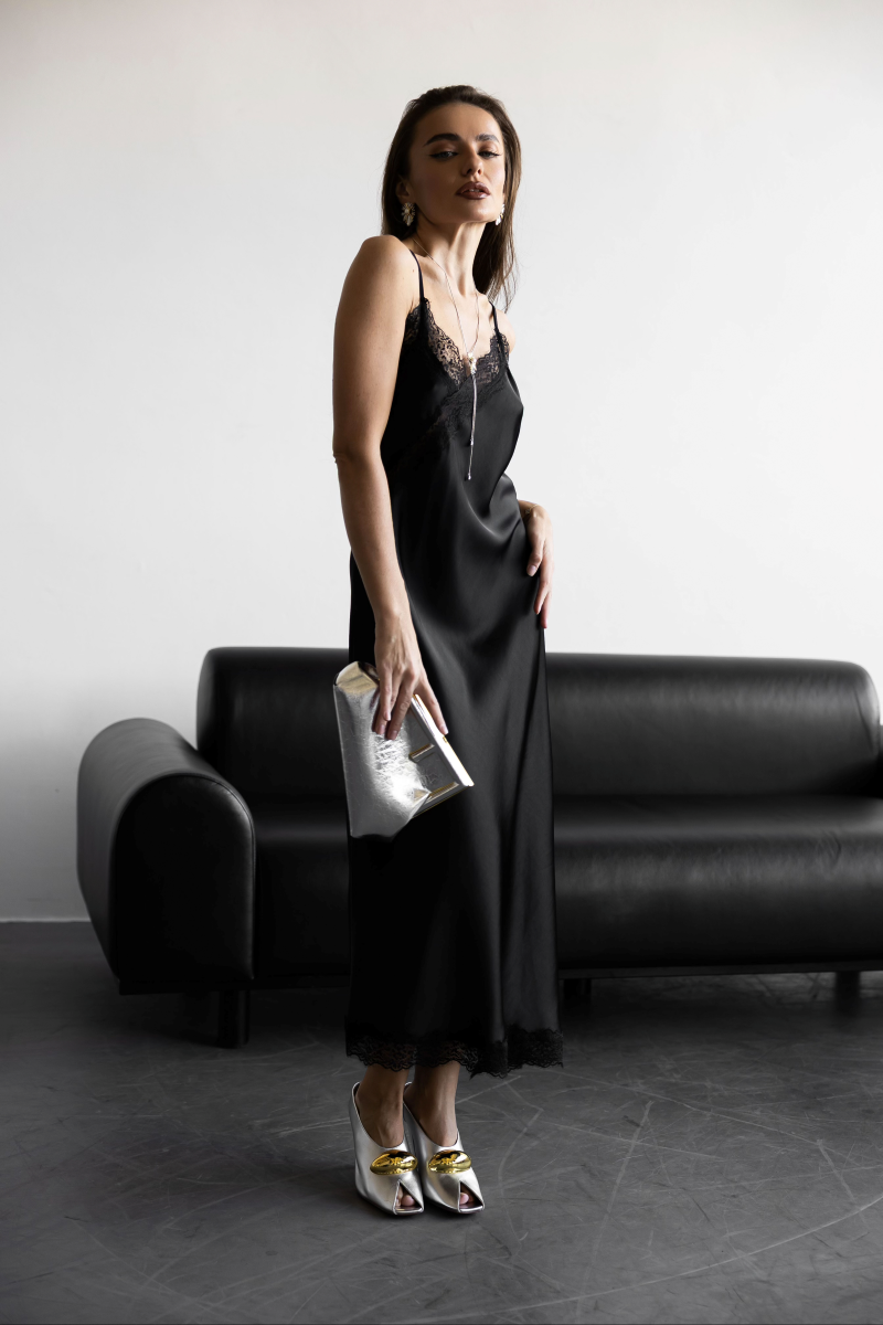 Елегантна чорна сукня-комбінація довжини міді з витонченими мереживними деталями на ліфі, подолі та боковій частині. Виготовлена з делікатної сатинової тканини, приємної до тіла. Тонкі бретелі, лаконічний крій, візуально подовжують силует. Легка та жіночна модель, яку можна носити як окремо, так і в багатошарових образах.