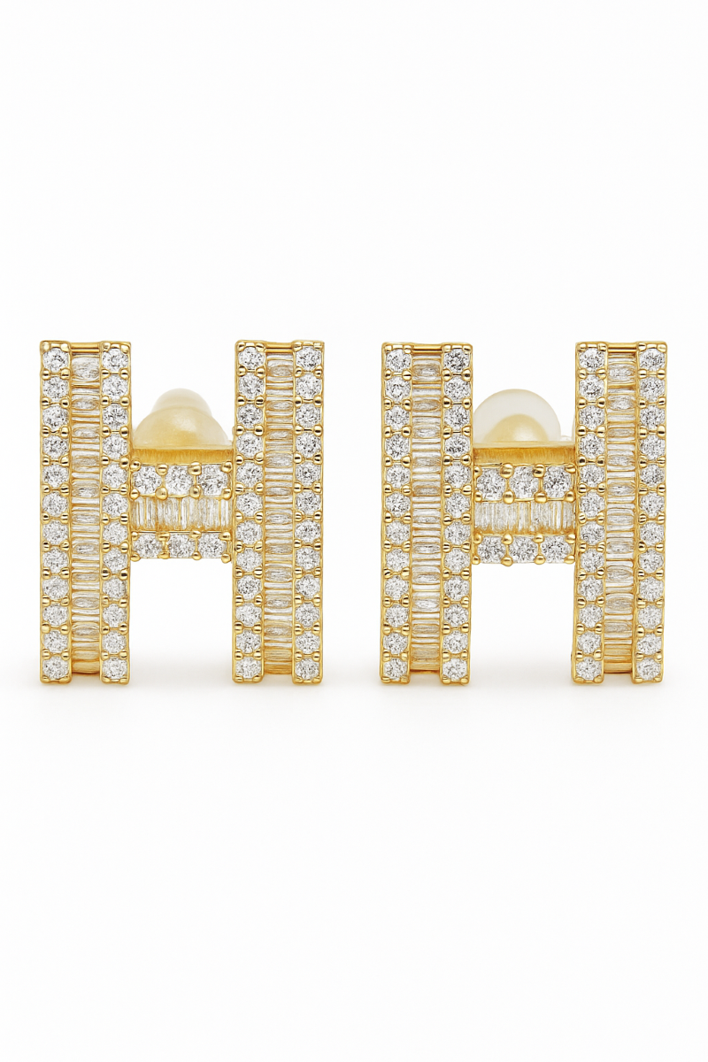 Поєднання круглих та багетних (витягнутих) каменів створює преміальний об’єм, а золотиста основа додає тепла та елегантності. Дизайн виглядає сучасно, вишукано та візуально нагадує ювелірні вироби high-end брендів.