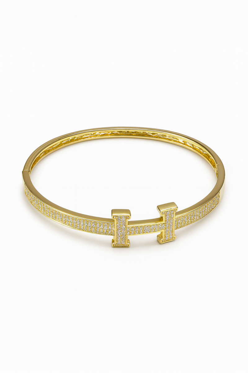 Це вишуканий жорсткий браслет у золотистому відтінку, інкрустований дрібними кристалами по всій довжині. Центральним акцентом виступає подвоєний елемент у формі літери H, повністю оздоблений сяйливими каменями.