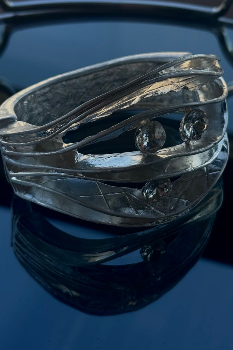 Масивний дизайнерський браслет у срібному кольорі, виконаний у скульптурному форматі з багатошаровими хвилястими лініями.