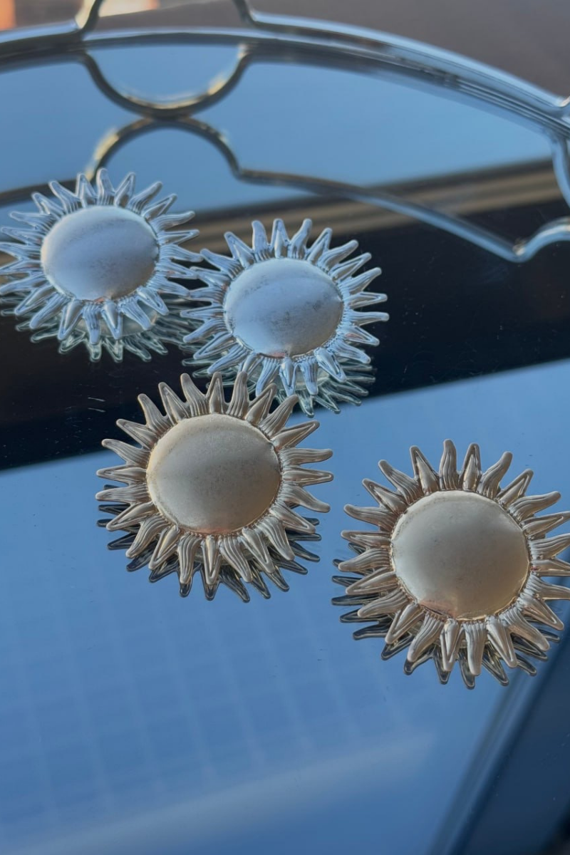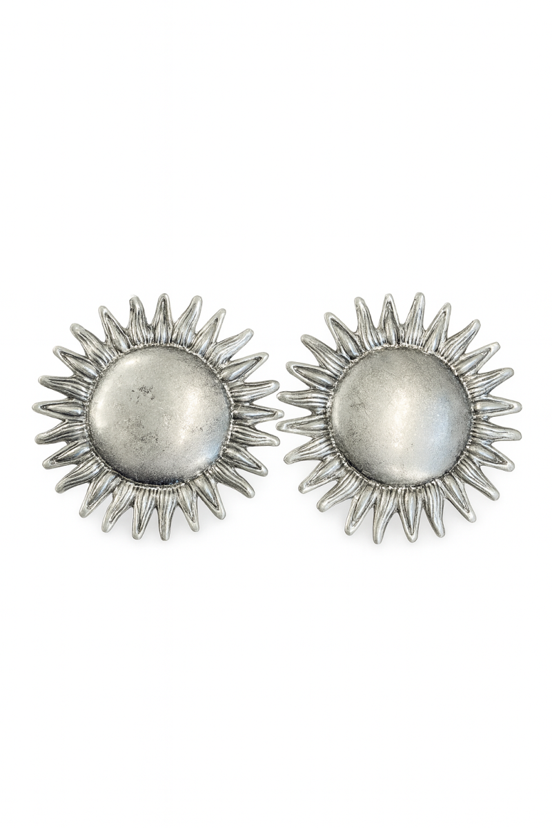 Ці сережки — виразна інтерпретація мотиву сонця в сучасному металічному дизайні. Сріблястий відтінок, рельєфні промені та обтічний центр створюють баланс між жорсткою графікою та м’якою геометрією.