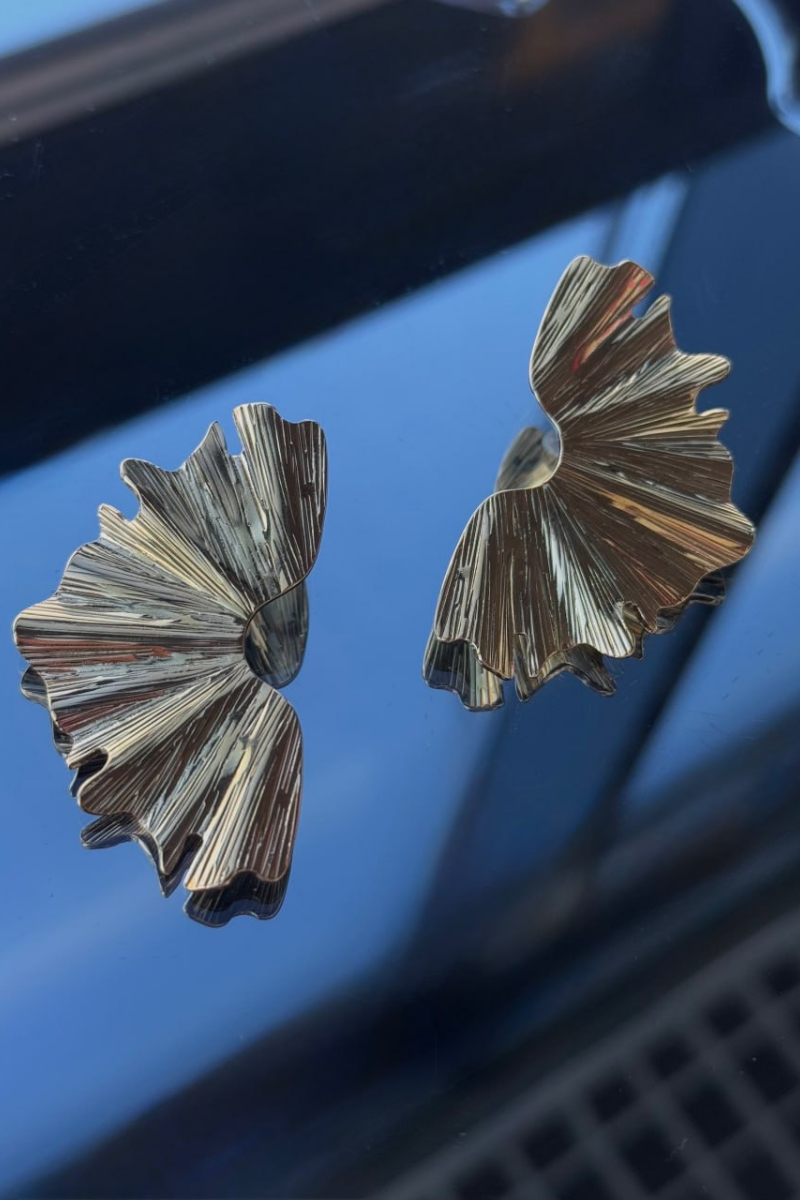 Ефектні сережки зі складчастим металевим дизайном, що імітує рух пелюсток або віяла. Характерна фактура створює багатовимірне сяйво та підкреслює риси обличчя.