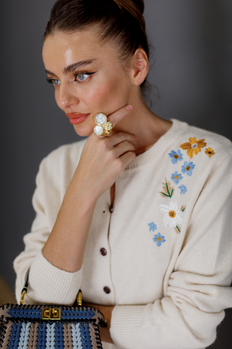 У кадрі — виразний перстень, який працює як центральний акцент образу. Його золота фактура виглядає ручною роботою, а перламутрові міні-сфери додають гри світла та відчуття модної екстравагантності.