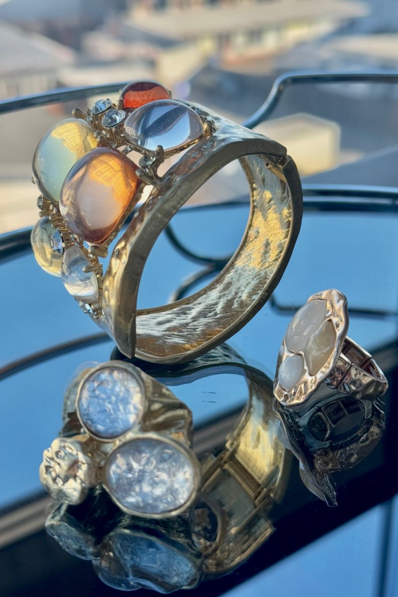А група каменів — у теплих бурштинових, прозорих та молочних відтінках — створює ефект дорогоцінної мозаїки, що привертає погляд навіть на відстані.