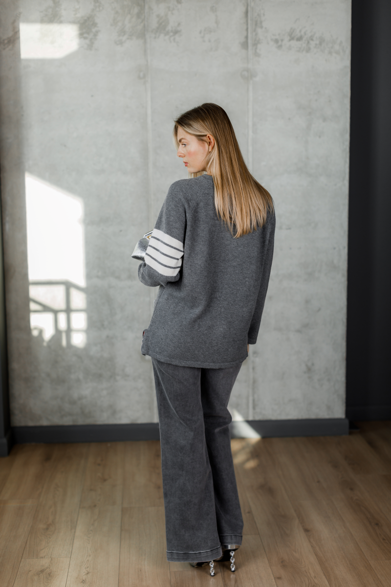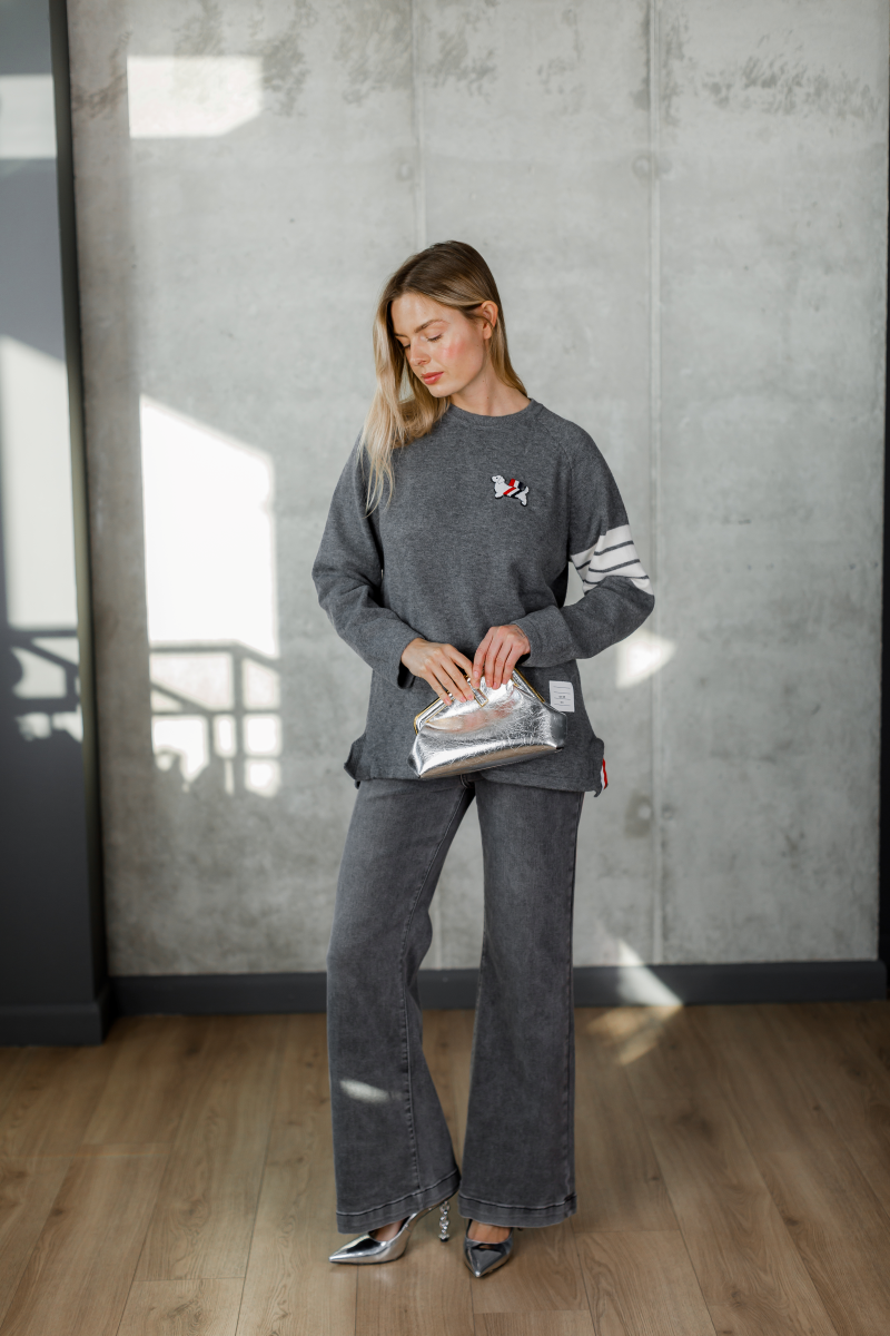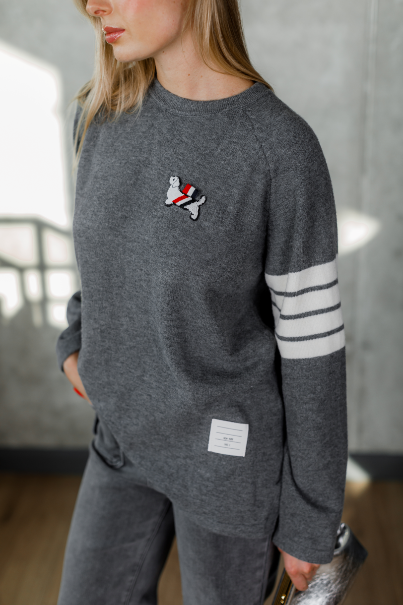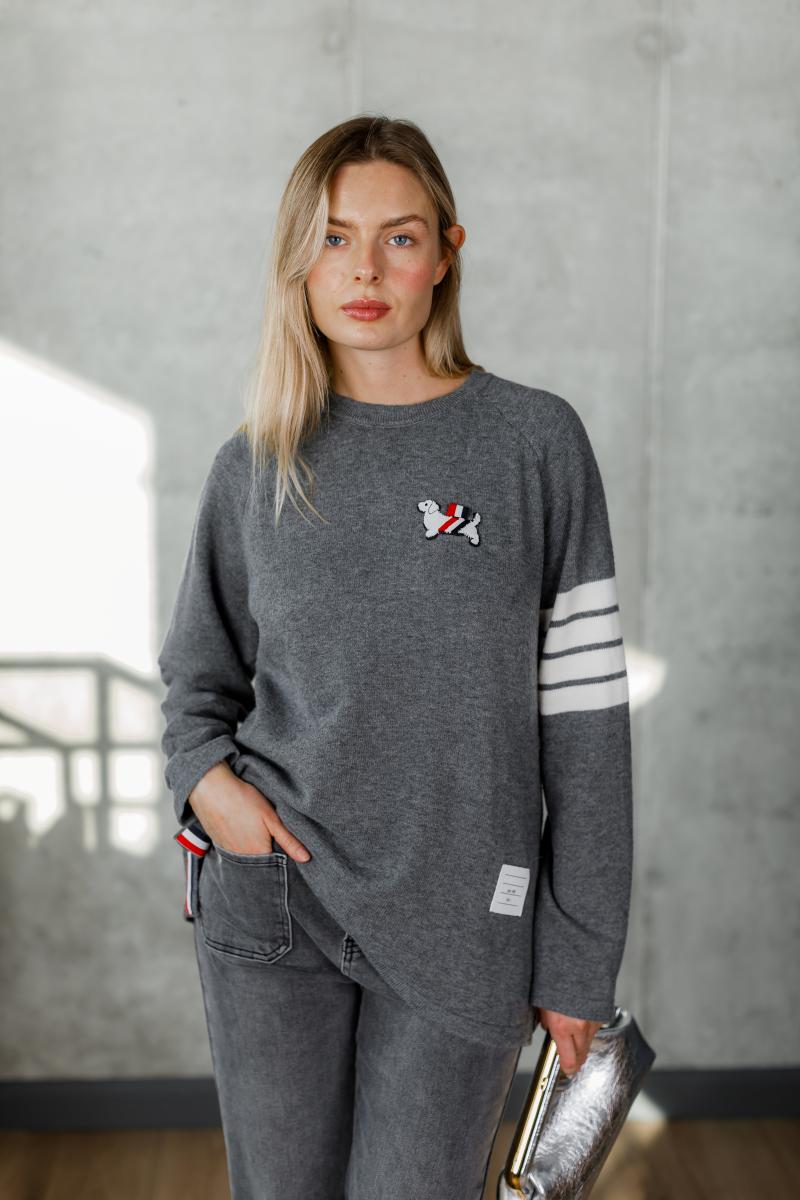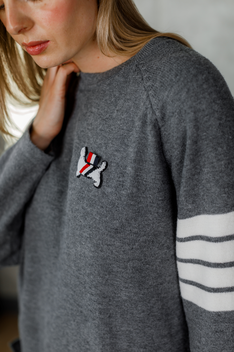 Лаконічний светр в ідеальному сірому відтінку з акцентом у вигляді вишитої аплікації овечки та фірмових смуг на рукаві — вишукане втілення стилю Thom Browne.