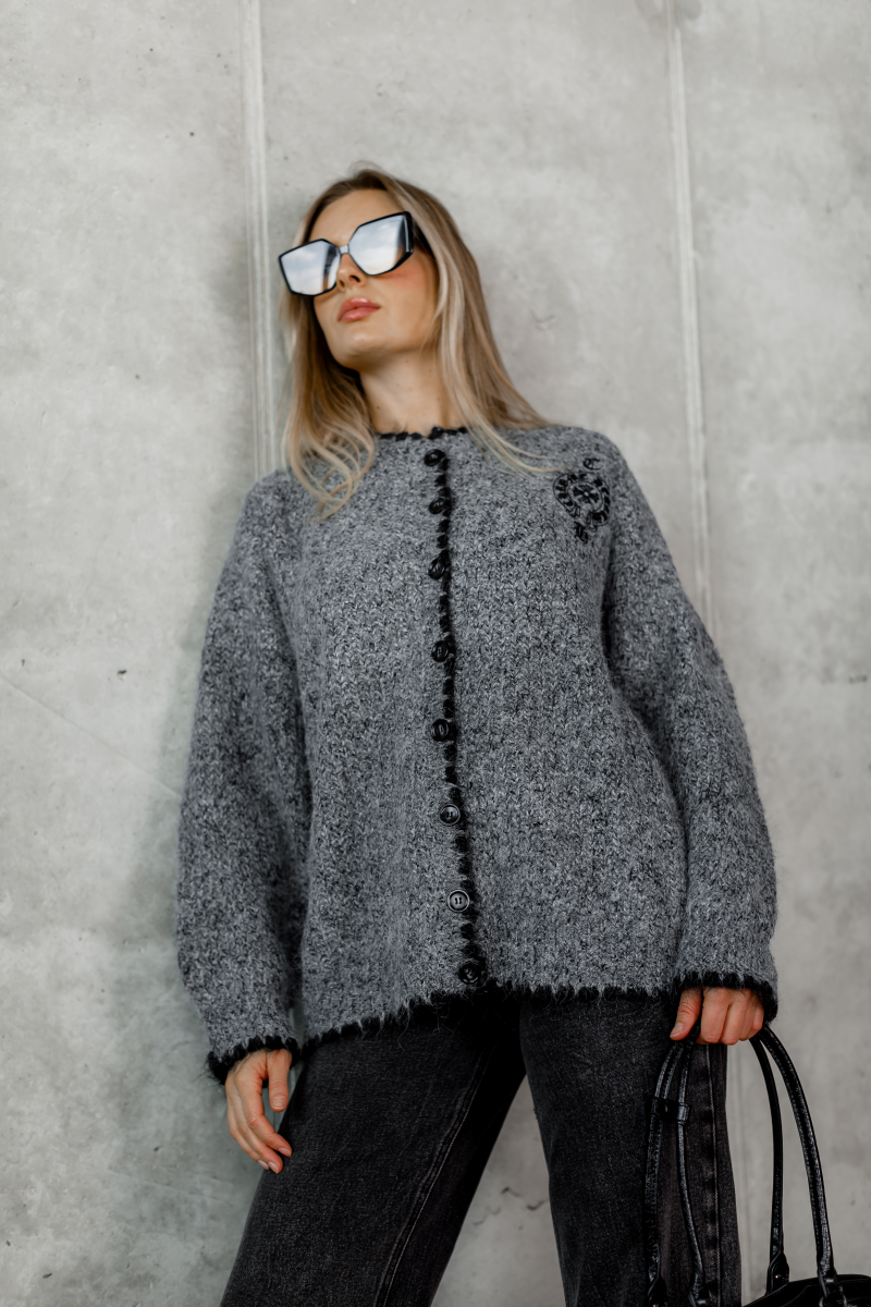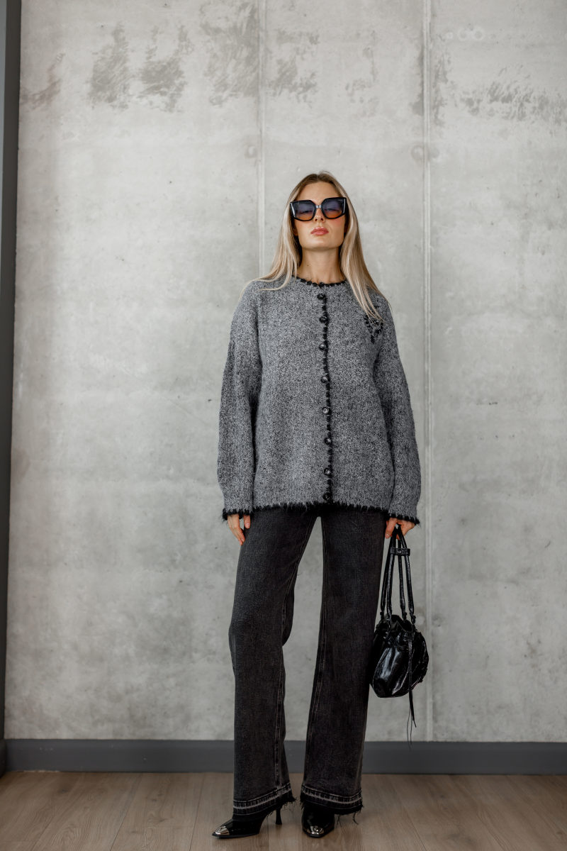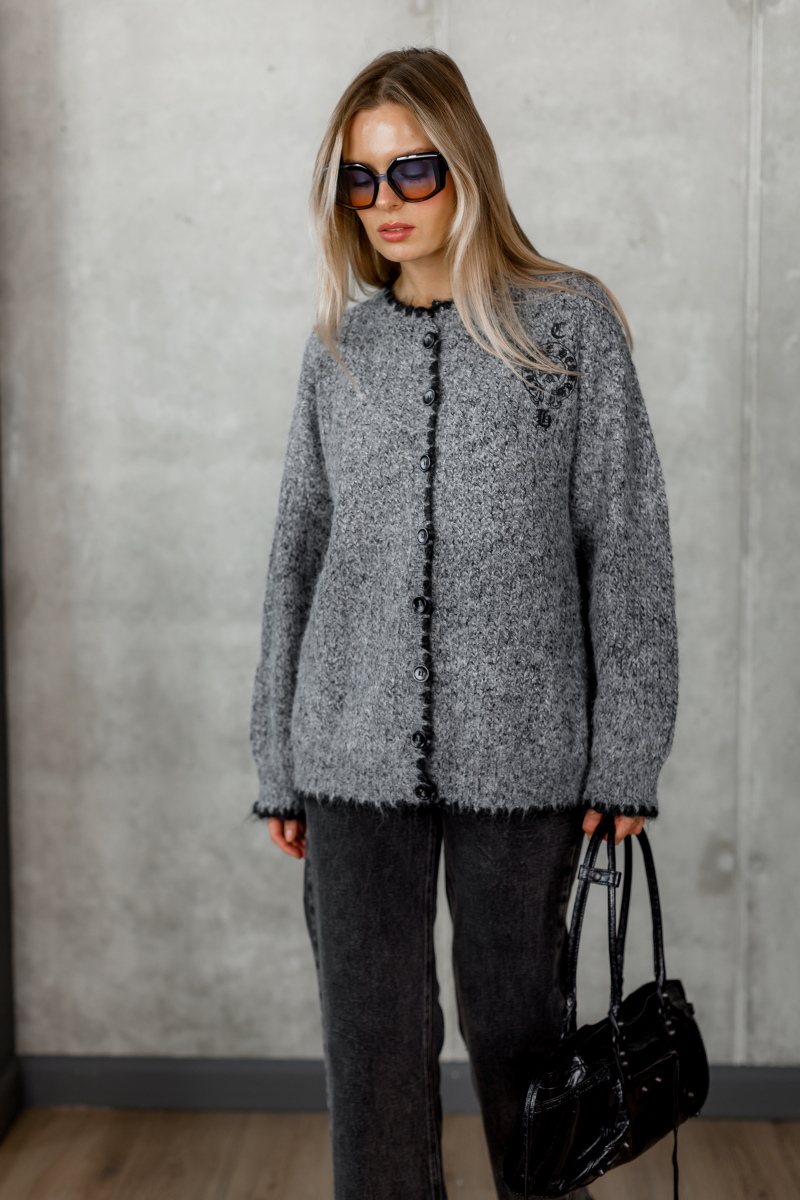 Об’ємний в’язаний светр у стилі Chrome Hearts із фірмовим готичним хрестом. М’який меланжевий матеріал світло-сірого кольору, ефектний дизайн з контрастною лінією ґудзиків та декоративними деталями.