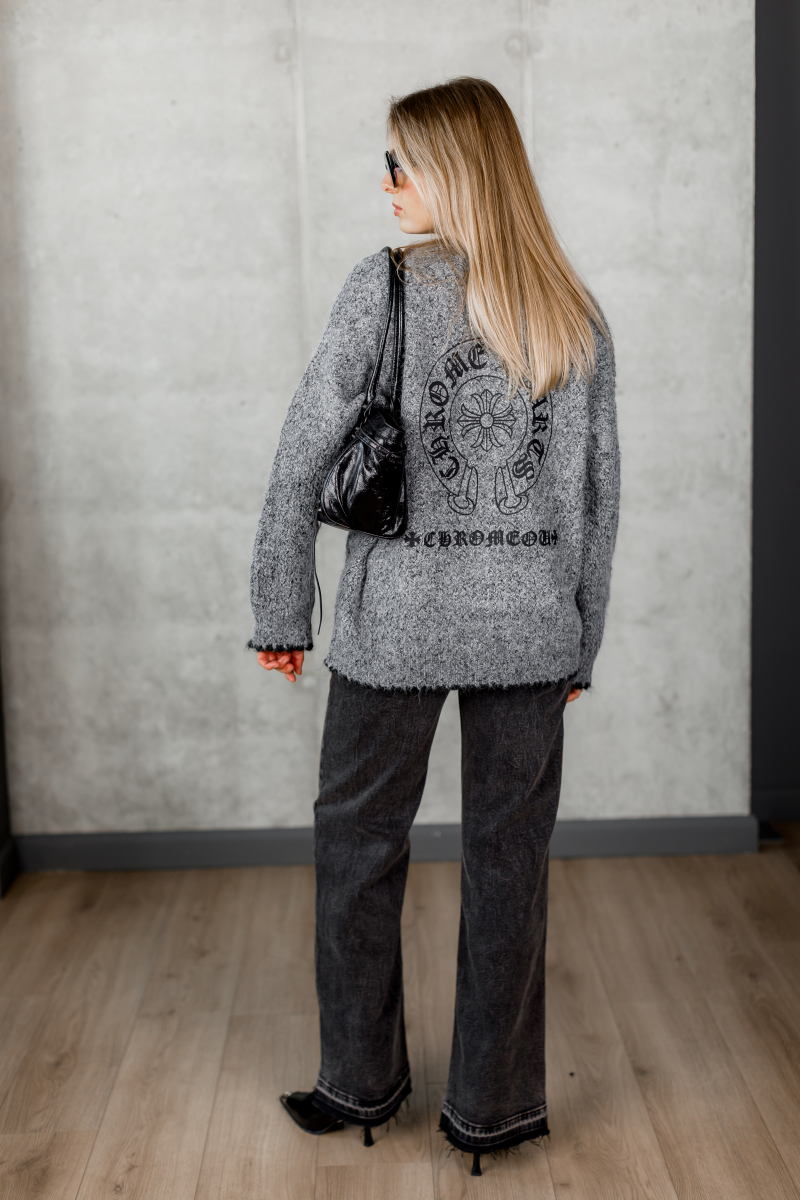 Светр натхненний естетикою культового бренду Chrome Hearts — це вдале поєднання комфорту, стилю та брутальної елегантності. Виконаний із м’якої меланжевої пряжі світло-сірого відтінку, він ідеально підійде як для повсякденних образів, так і для вечірніх виходів.