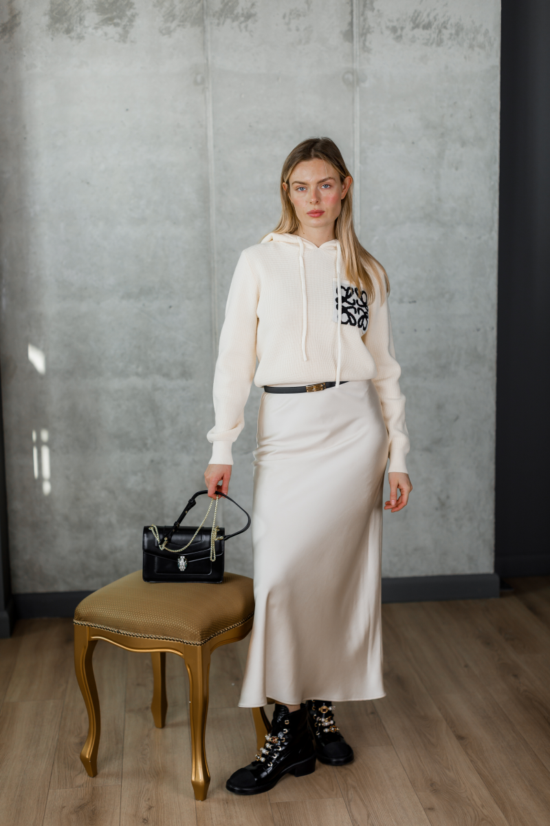 Жіночий светр oversize крою з м’якої фактурної пряжі в модному стилі Loewe. Молочний відтінок додає ніжності, а фірмовий об’ємний логотип на грудях створює акцент. Капюшон зі шнурівками доповнює комфортний дизайн, ідеально підходить для повсякденного та вуличного стилю. Підходить як для осінньо-зимового сезону, так і для прохолодної весни.