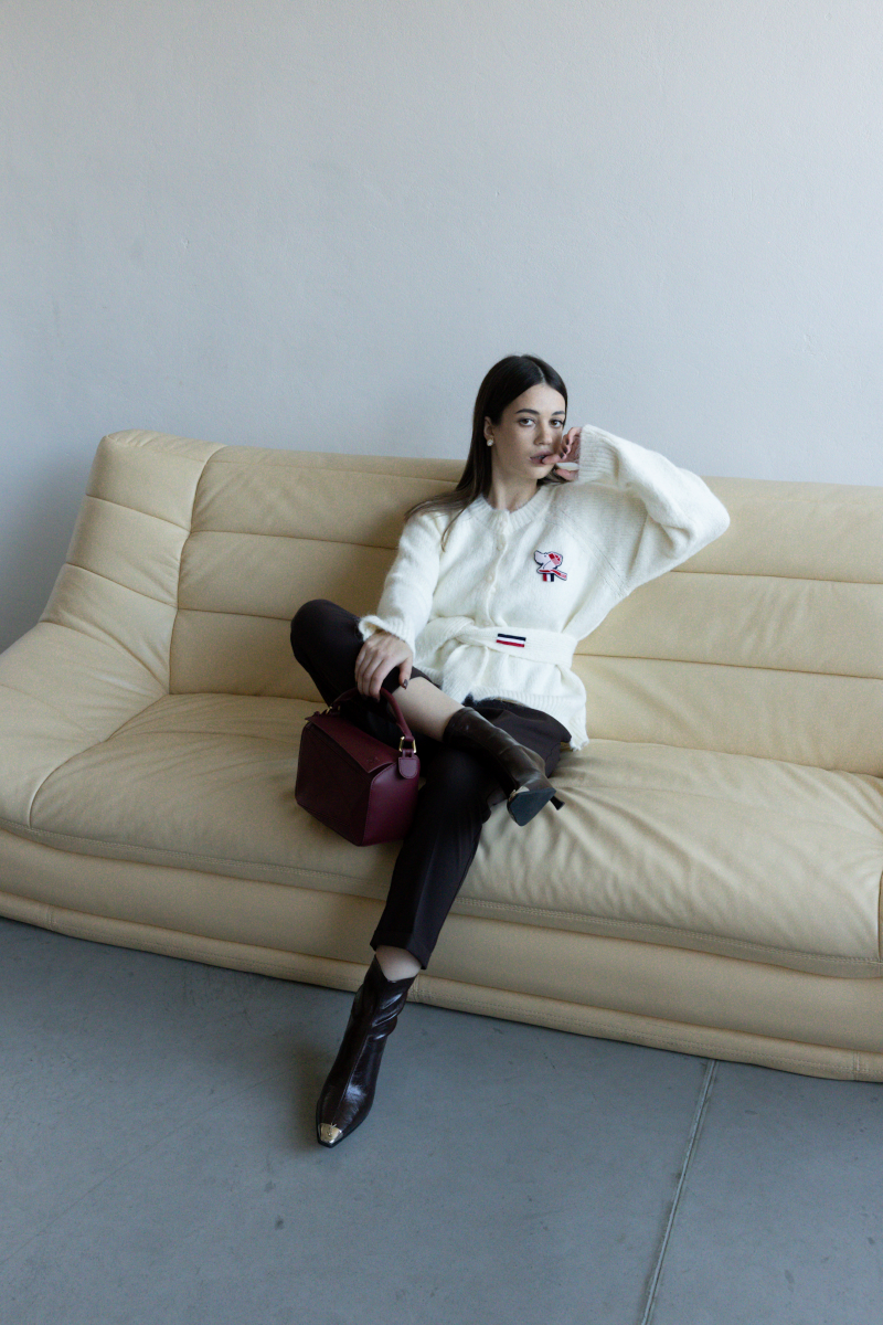 Кардиган прикрашений фірмовими деталями бренду: характерною аплікацією такси та триколірною смужкою на поясі. Завдяки вільному крою та паску-шарфу, модель можна стилізувати різними способами — від класичного до кежуал-луку.