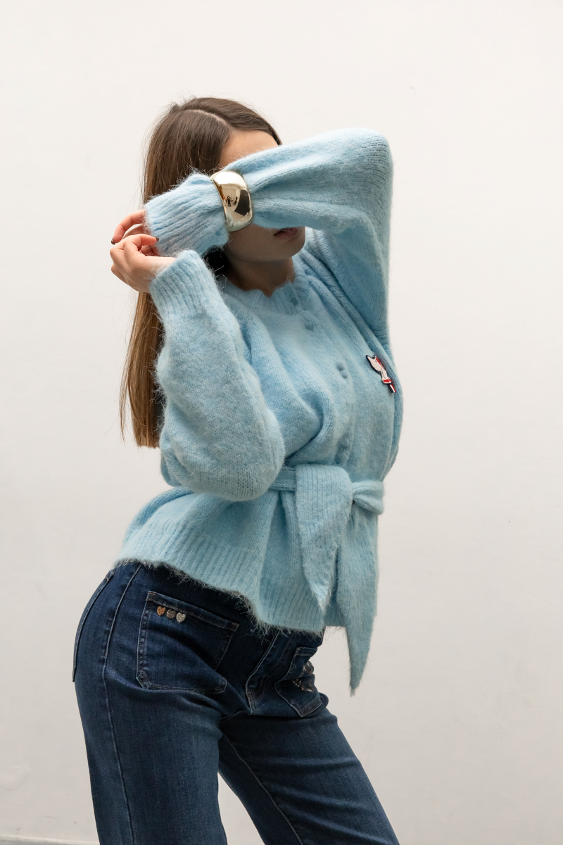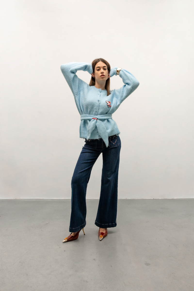Ніжний небесно-блакитний відтінок цього кардигана надає образу свіжості та легкості. Виготовлений з м’якої мохерової пряжі, виріб дарує тепло й комфорт, залишаючись повітряним і приємним до тіла. Дизайн витриманий у характерному стилі Thom Browne — впізнаваний триколор і декоративна такса додають сучасного шарму та статусності.