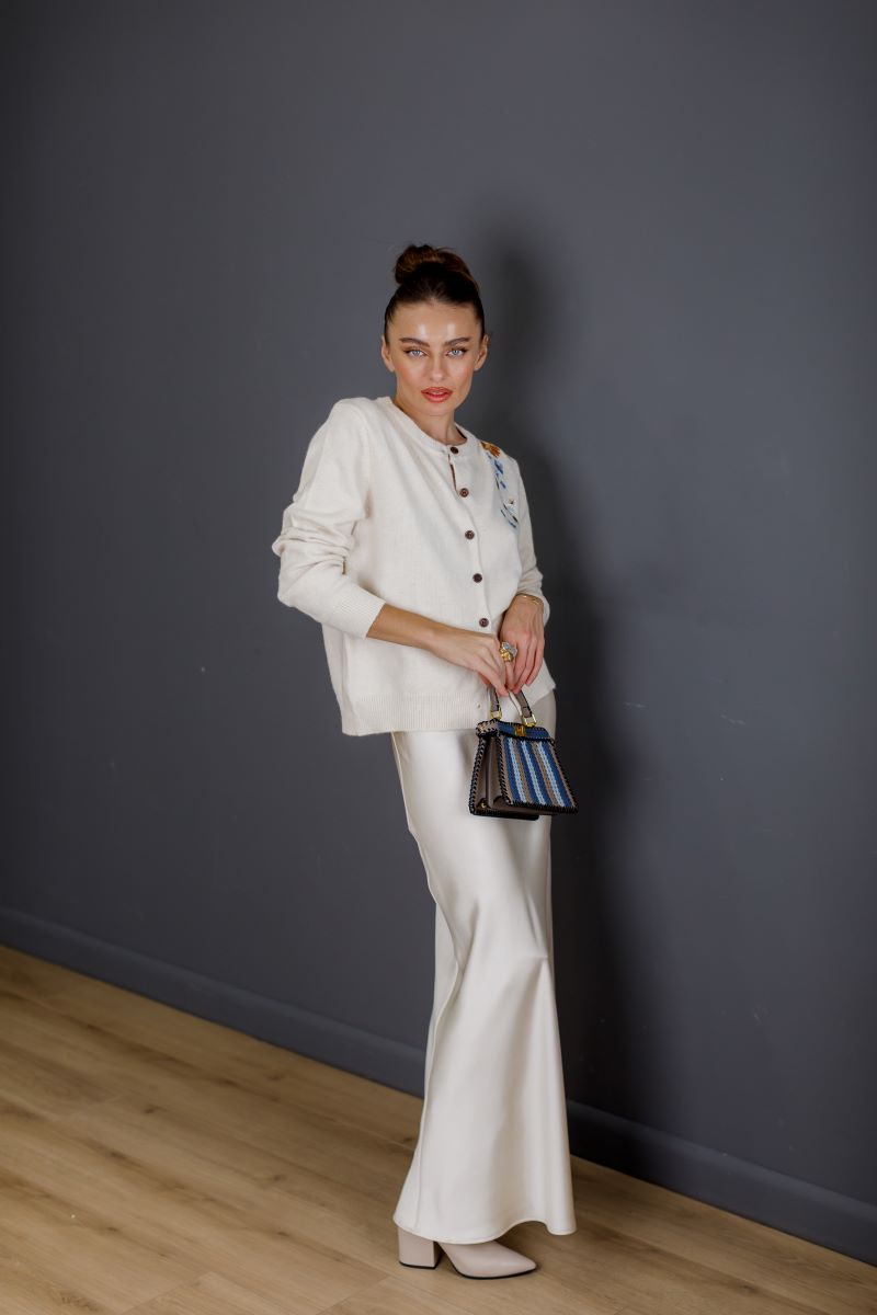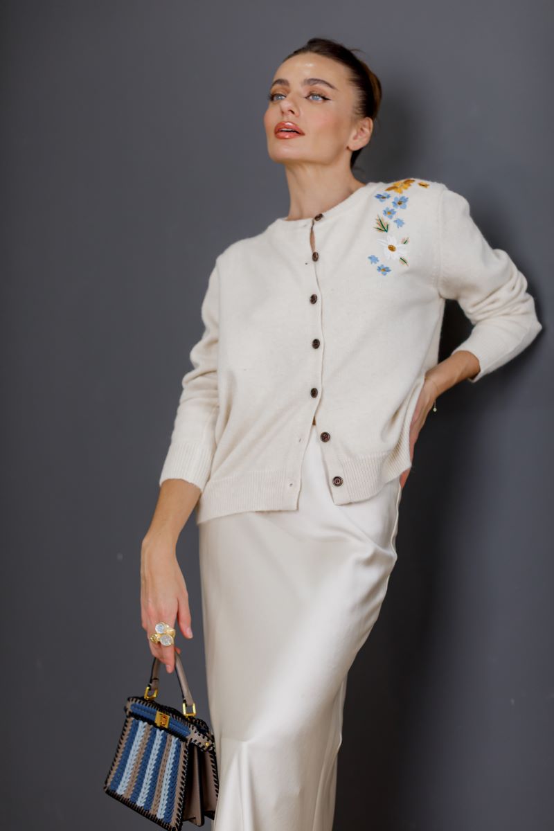 Прикрашений вишивкою дрібних квітів у відтінках блакитного, білого та жовтого, що додає образу ніжності та легкого французького шику.