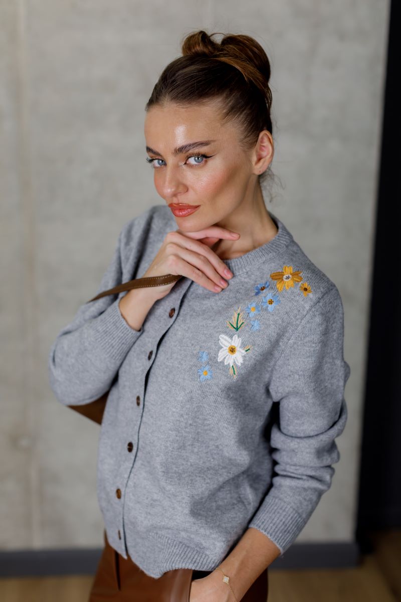 Ніжний і витончений кардиган з делікатною вишивкою квітів додає образу жіночності та шарму.