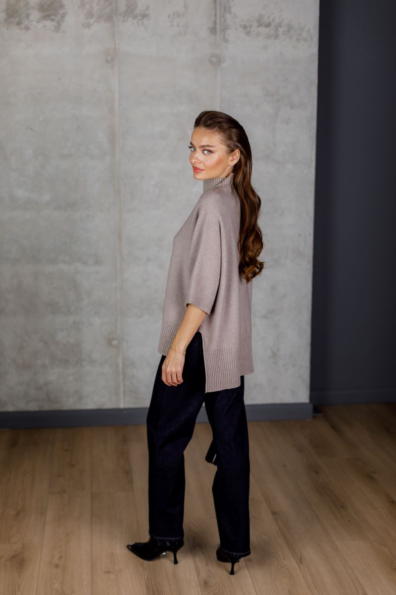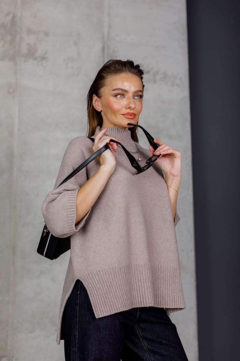 Светр з м’якої бежевої пряжі має вільний крій та комір-стійку.