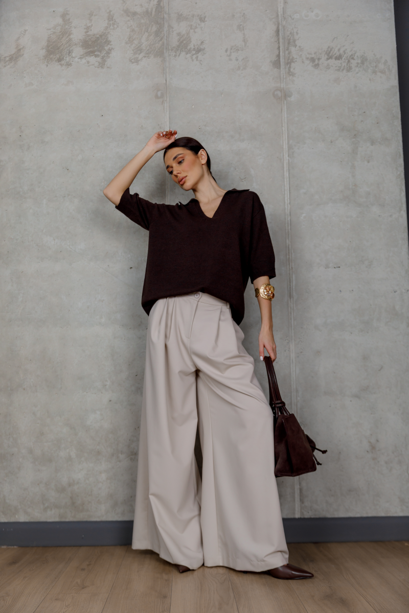 V-подібний виріз із м’яким коміром делікатно підкреслює лінію шиї, а вільний крій створює розслаблений, але водночас елегантний силует.