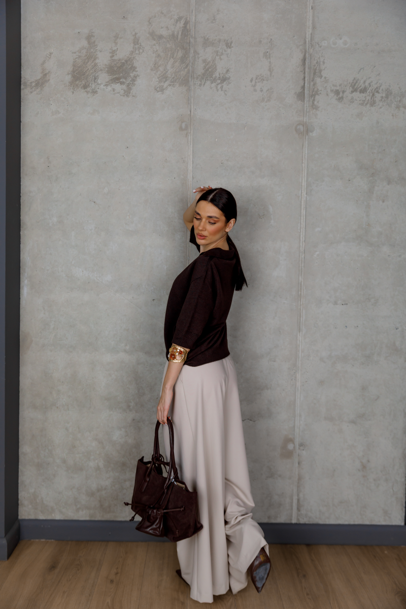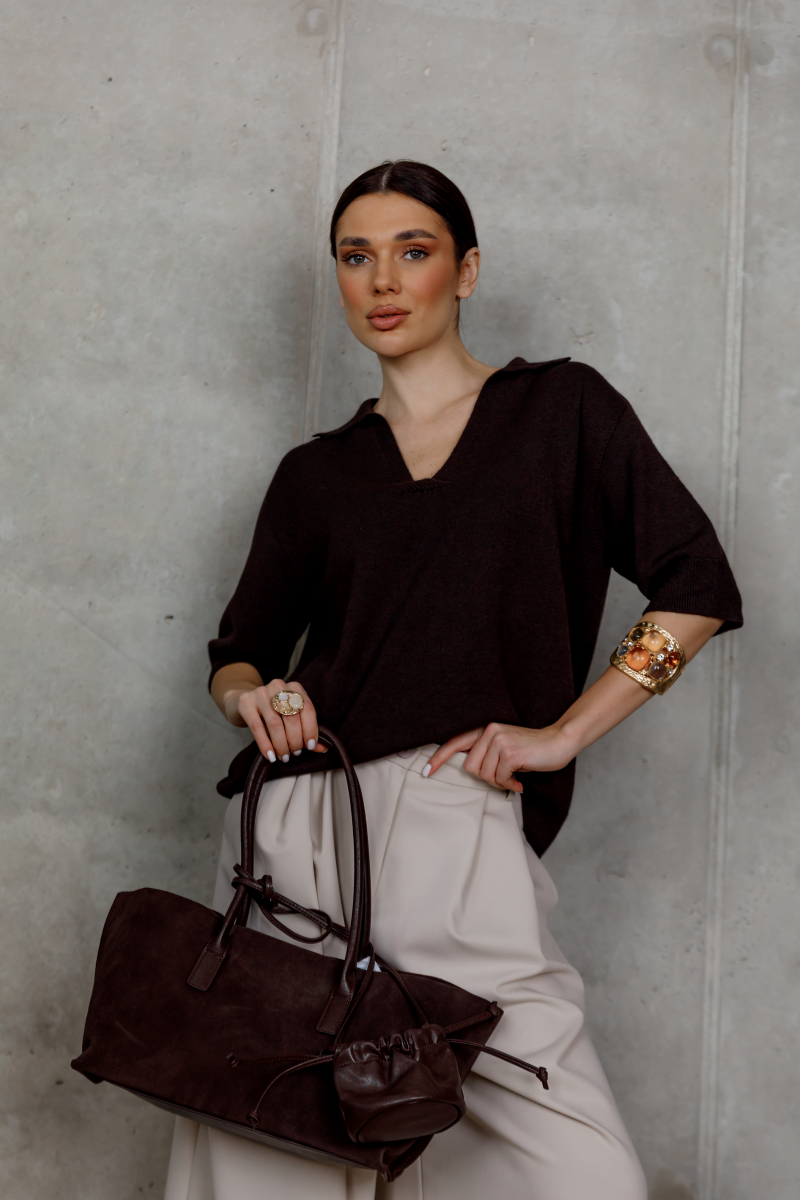 Стильний светр у глибокому шоколадному відтінку виглядає благородно та легко інтегрується в базовий гардероб.