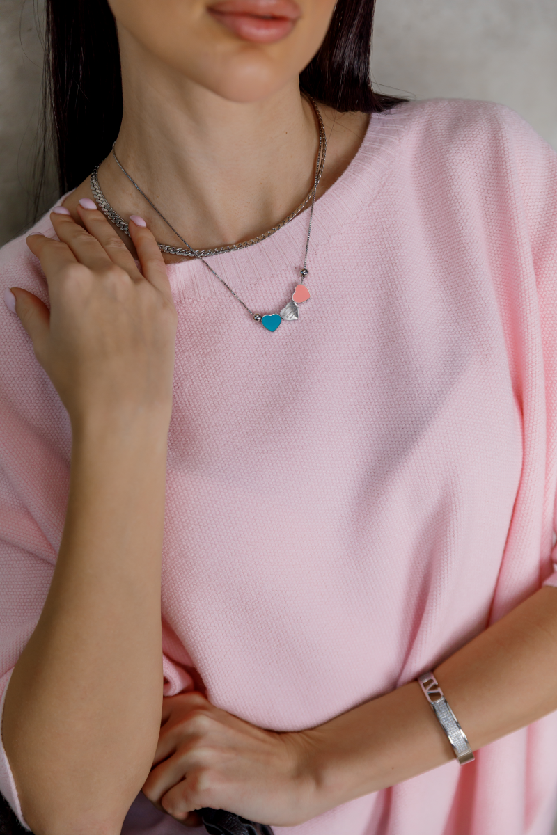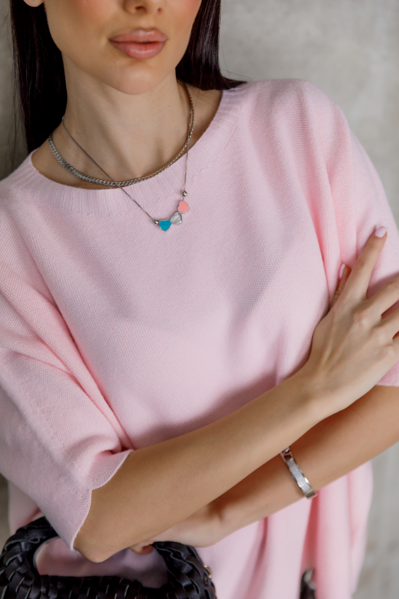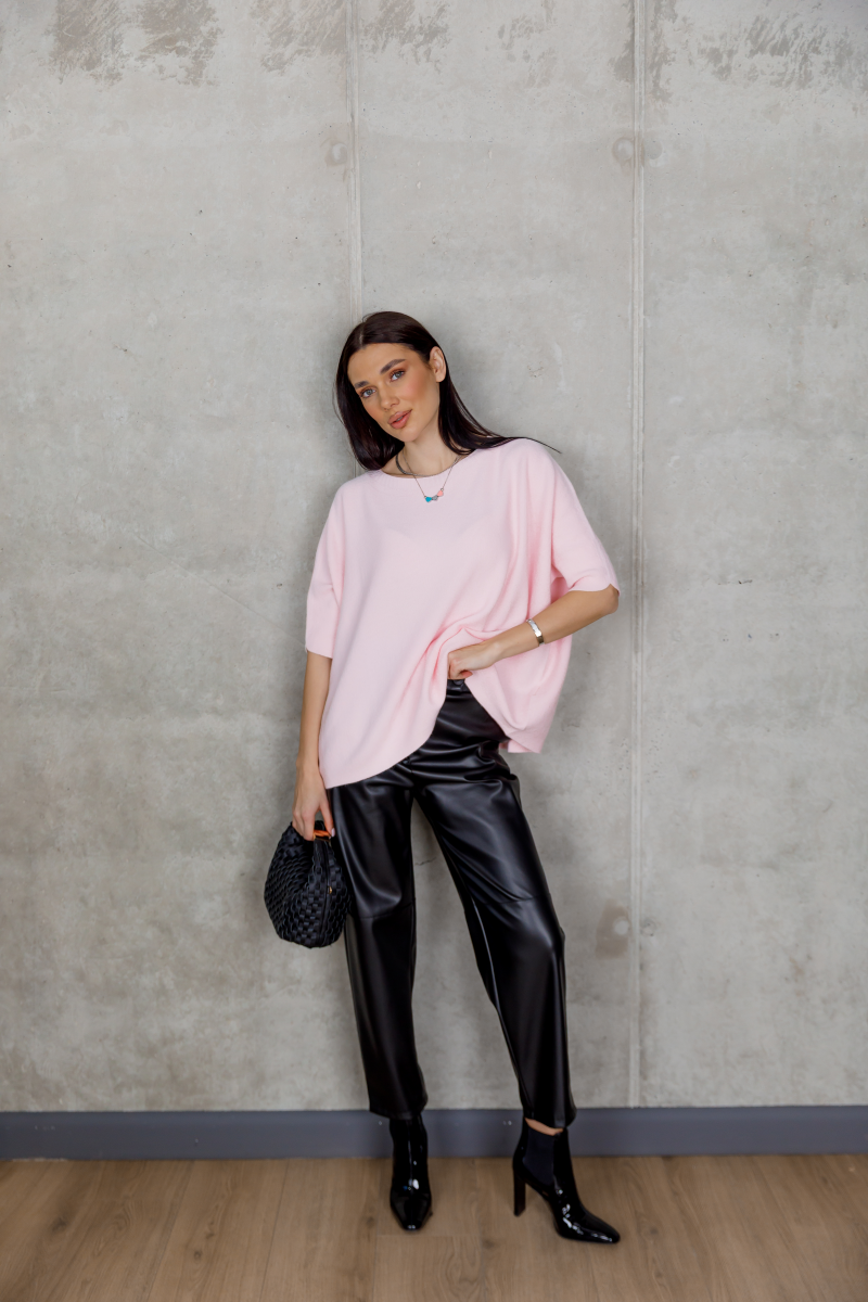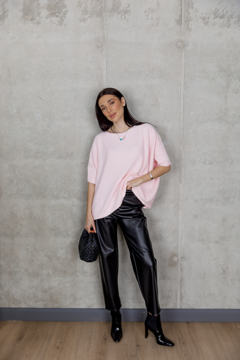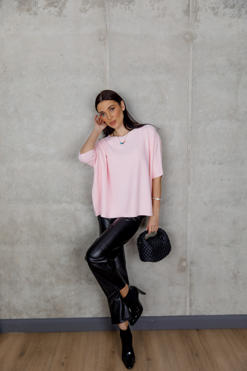 Рожевий светр із лаконічним кроєм — м’який акцент у повсякденному гардеробі.
