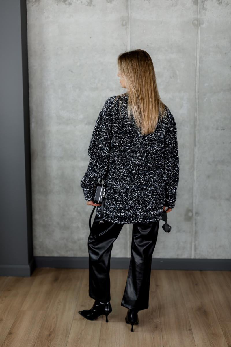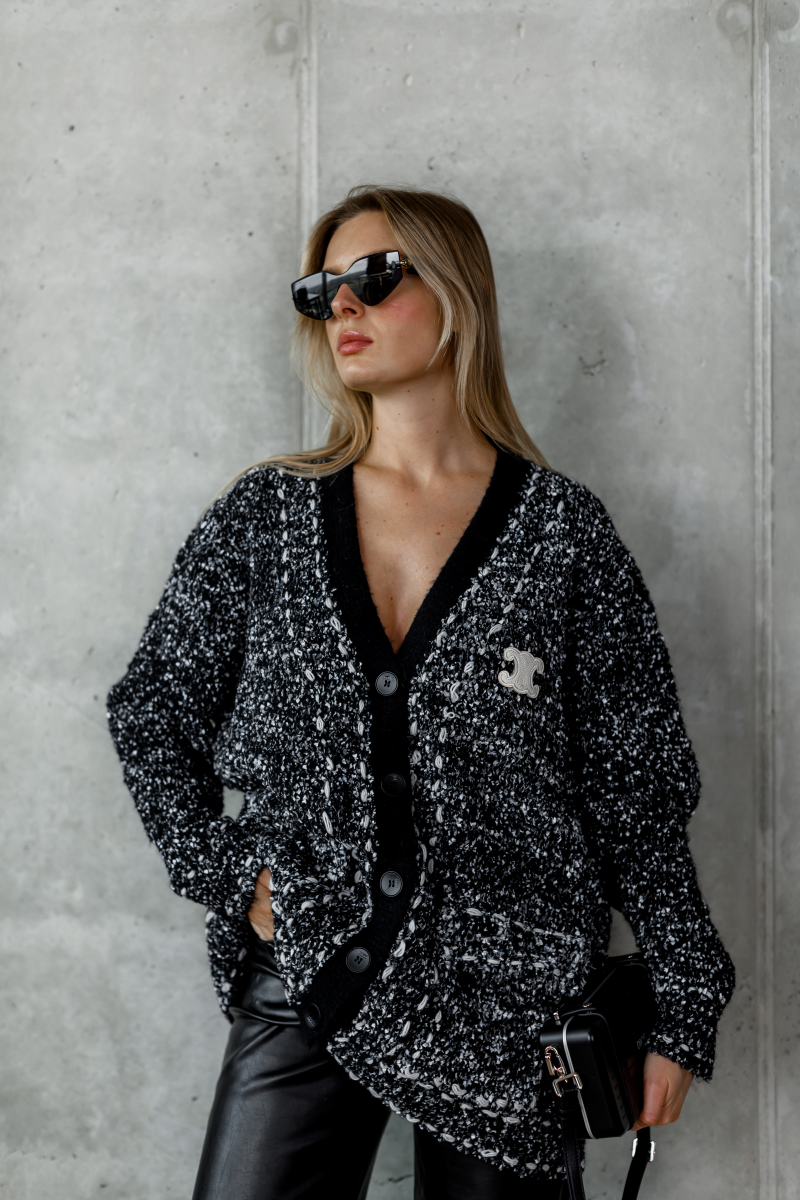 Кардиган виконаний у вінтажному стилі Chanel з характерним букльованим трикотажем, що створює ефект глибини та фактурності. Ідеально поєднується як із класичними брюками, так і з повсякденними джинсами, додаючи образу нотки шику.