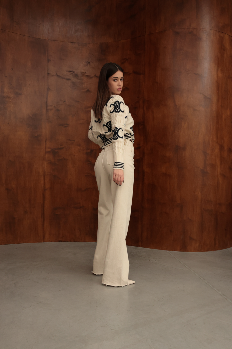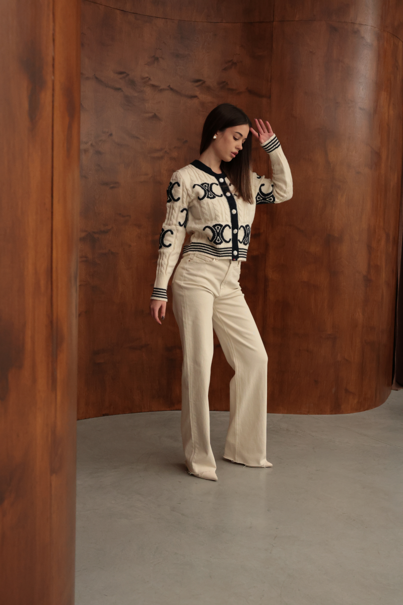 Елегантний трикотажний кардиган молочного кольору, натхненний естетикою бренду Celine. Декорований контрастним темно-синім орнаментом та ґудзиками з гравіюванням, які підкреслюють розкішний характер виробу. М'який та приємний до тіла матеріал створює комфортне відчуття тепла, зберігаючи легкість образу.
