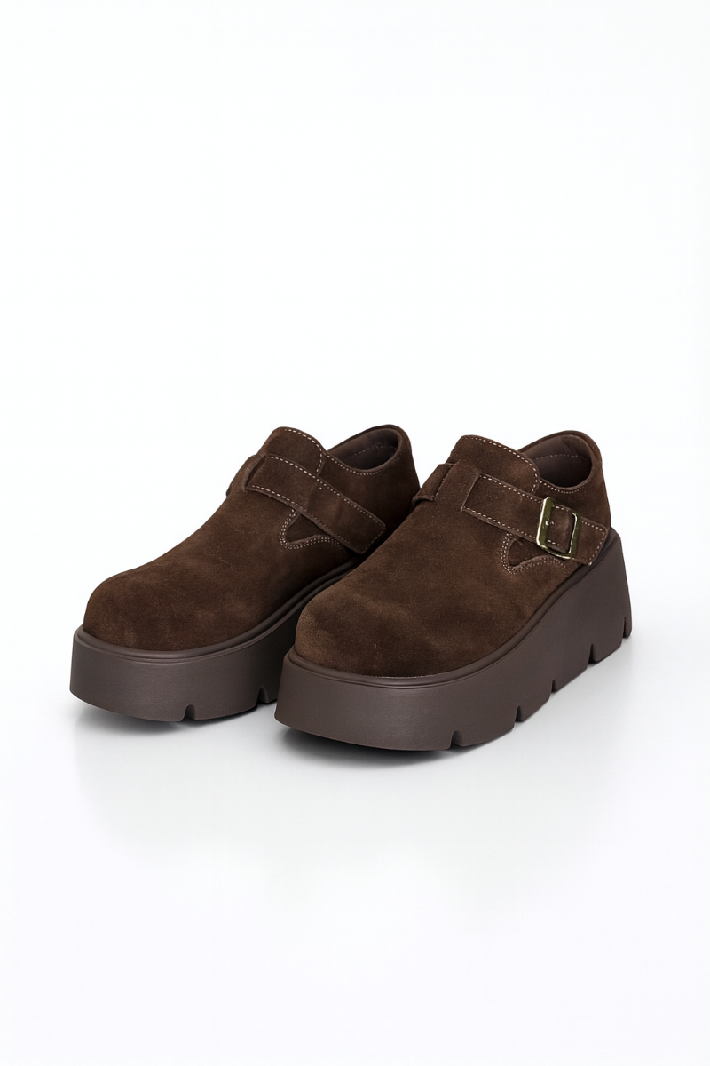У цих темно-коричневих замшевих платформах є м’якість, тепло і впевнена сила стилю. Вони створені для жінки, яка цінує комфорт так само сильно, як і красу деталей.