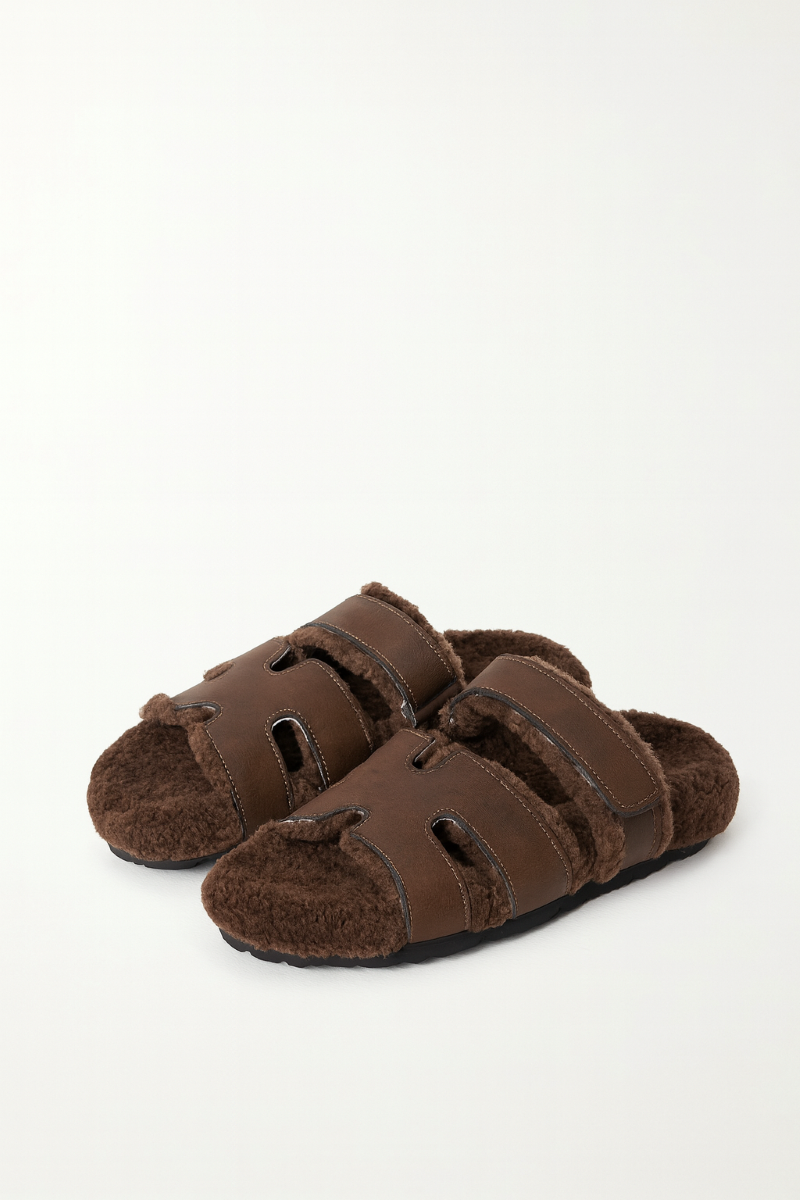 Ці хутряні шльопанці у насиченому шоколадному відтінку — ідеальна формула зимового комфорту. М’яка ворсиста підкладка огортає ногу теплом, а матові ремінці додають структурності та сучасної естетики. Модель поєднує легкість домашнього затишку з міським характером — те, що редактори назвали б cozy luxury.