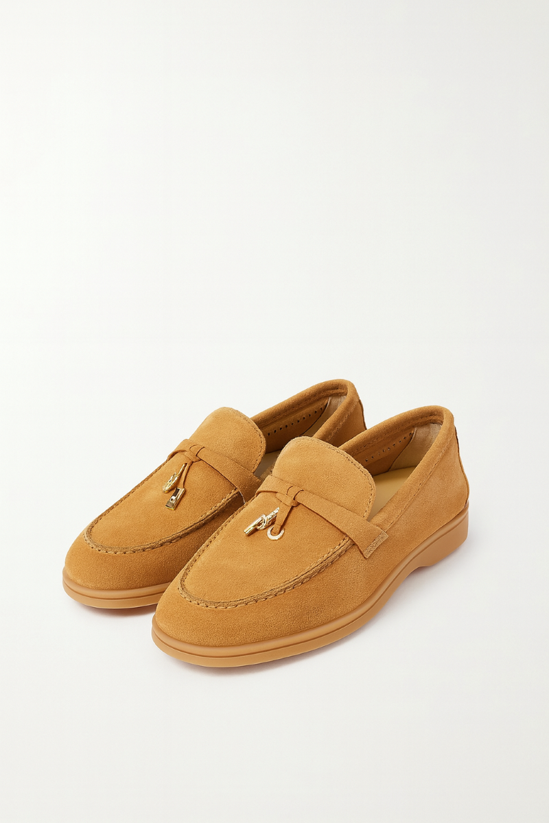 У світі, де комфорт давно став новою розкішшю, ці замшеві лофери у теплій карамельній палітрі створені для жінки, яка цінує деталі. М’яка фактура, стриманий силует і золотистий декор формують образ effortless elegance — тієї самої, яку ми бачимо на модних вулицях Парижа та Мілана.
