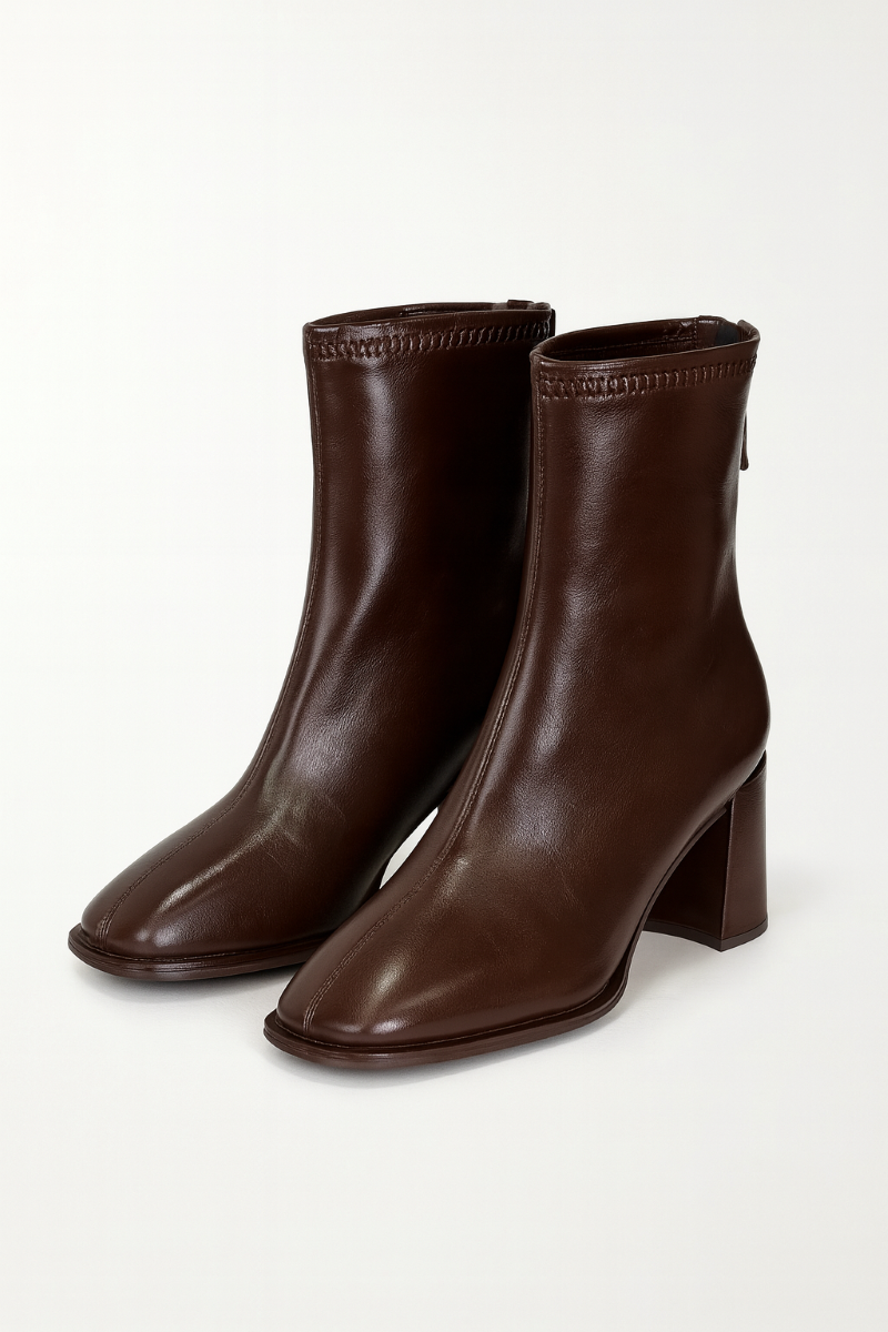 Елегантні шоколадні черевики на стійкому підборі створені для тих, хто цінує витонченість у кожній лінії. М’яка гладка шкіра, акуратний силует та ідеальна посадка роблять цю пару бездоганним доповненням до осінніх і зимових образів.