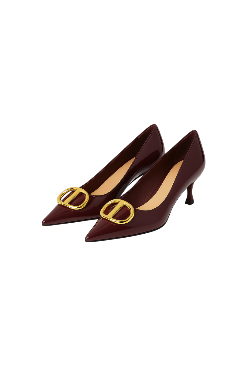 Ці бордові лаковані човники з витонченою золотою пряжкою поєднують елегантність класичного силуету та розкішний акцент. Завдяки загостреному носку й комфортним kitten-heels вони візуально подовжують ногу, даруючи впевнений, граційний крок у будь-якому образі