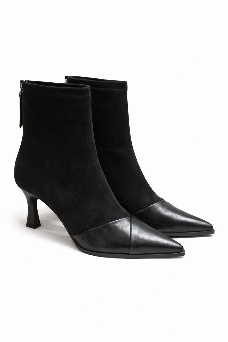 Жіночі ботильйони виконані у стильному поєднанні гладкої чорної шкіри в передній частині та м’якої замші на халяві, що створює виразний і сучасний дизайн.