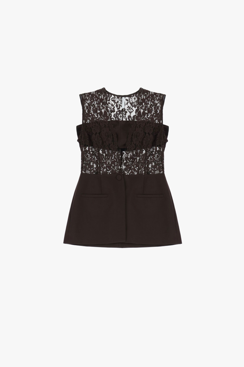 Стильний жіночий жилет, що поєднує в собі елегантність і сучасність, виконаний у глибокому шоколадному кольорі. Верхня частина виробу виготовлена з витонченого квіткового мережива, що створює ефект напівпрозорості та додає жіночності образу. Нижня частина — з щільної костюмної тканини, яка гарно тримає форму та виглядає стримано й лаконічно.