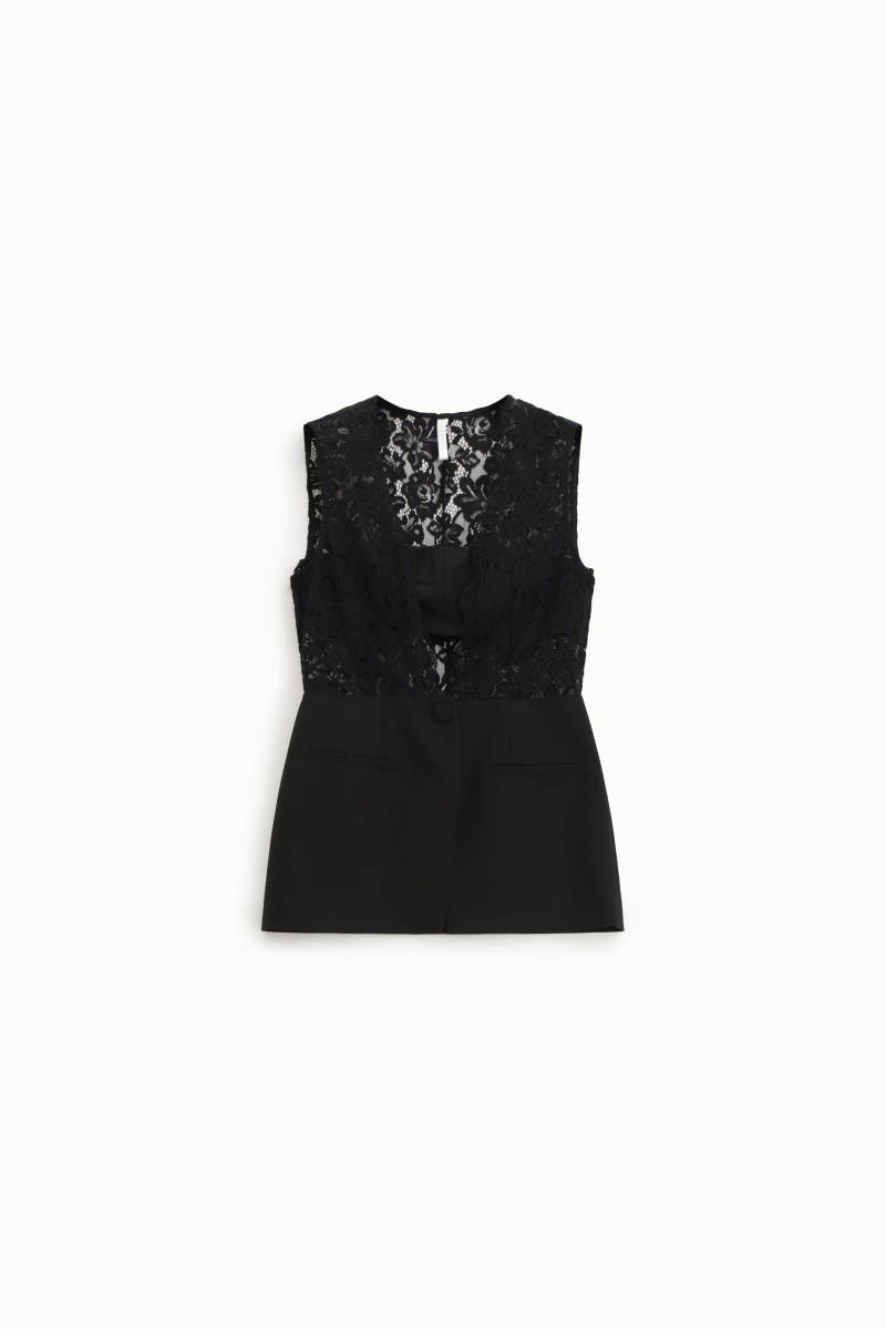 Жилет має контрастну комбінацію тканин — верх виконаний із делікатного прозорого мережива з флористичним візерунком, а нижня частина — з щільної костюмної тканини, яка створює чіткий силует.