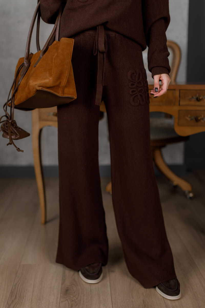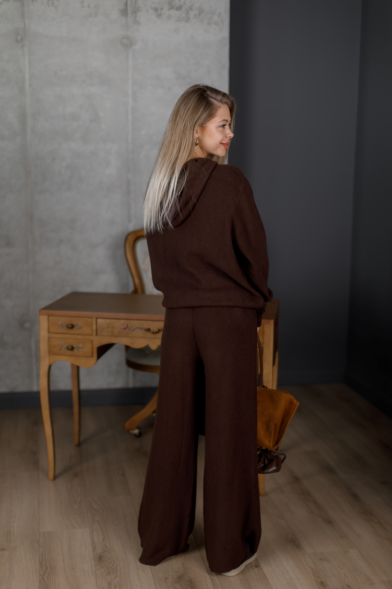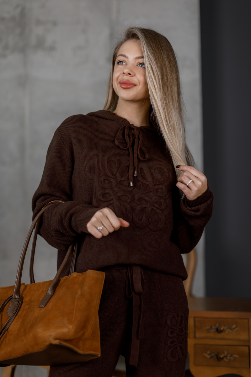 Шоколадний костюм з трикотажу преміальної якості, натхнений дизайном Loewe. Складається з худі з капюшоном та штанів-кльош із високою посадкою. Актуальний відтінок, приємна фактура і лаконічна вишивка у тон додають образу витонченості.
