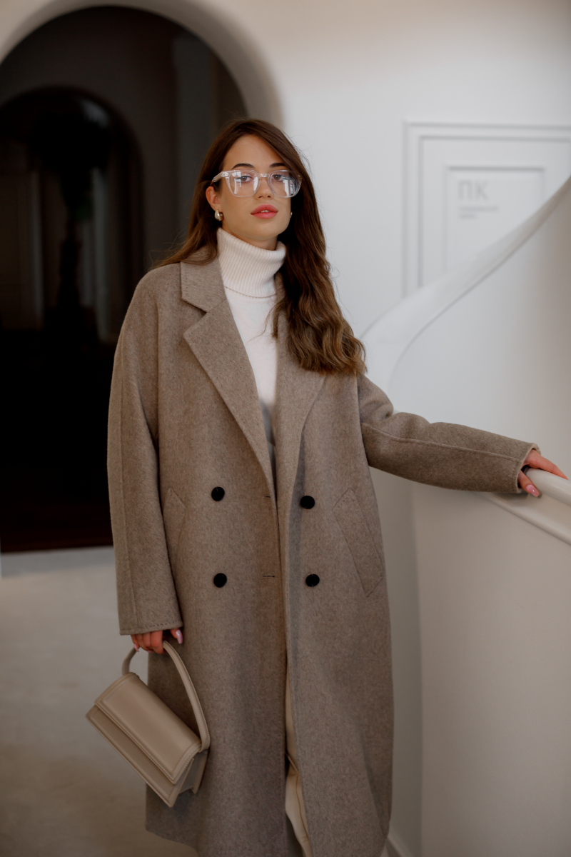 Класичне пальто міді довжини у відтінку теплий тауп — ідеальний вибір для базового гардеробу. Двобортний фасон підкреслює елегантність, а прямий силует пасує до будь-якої фігури. Пальто виглядає стримано, лаконічно й універсально: доречно як для офісу, так і для прогулянок.