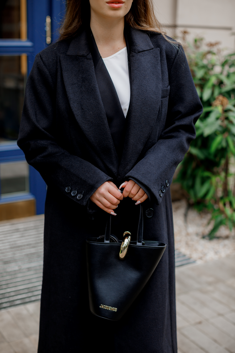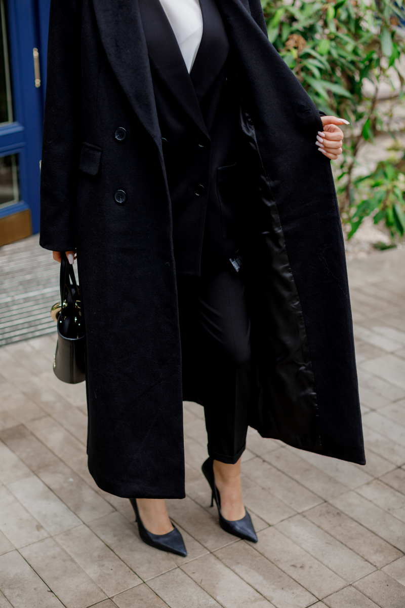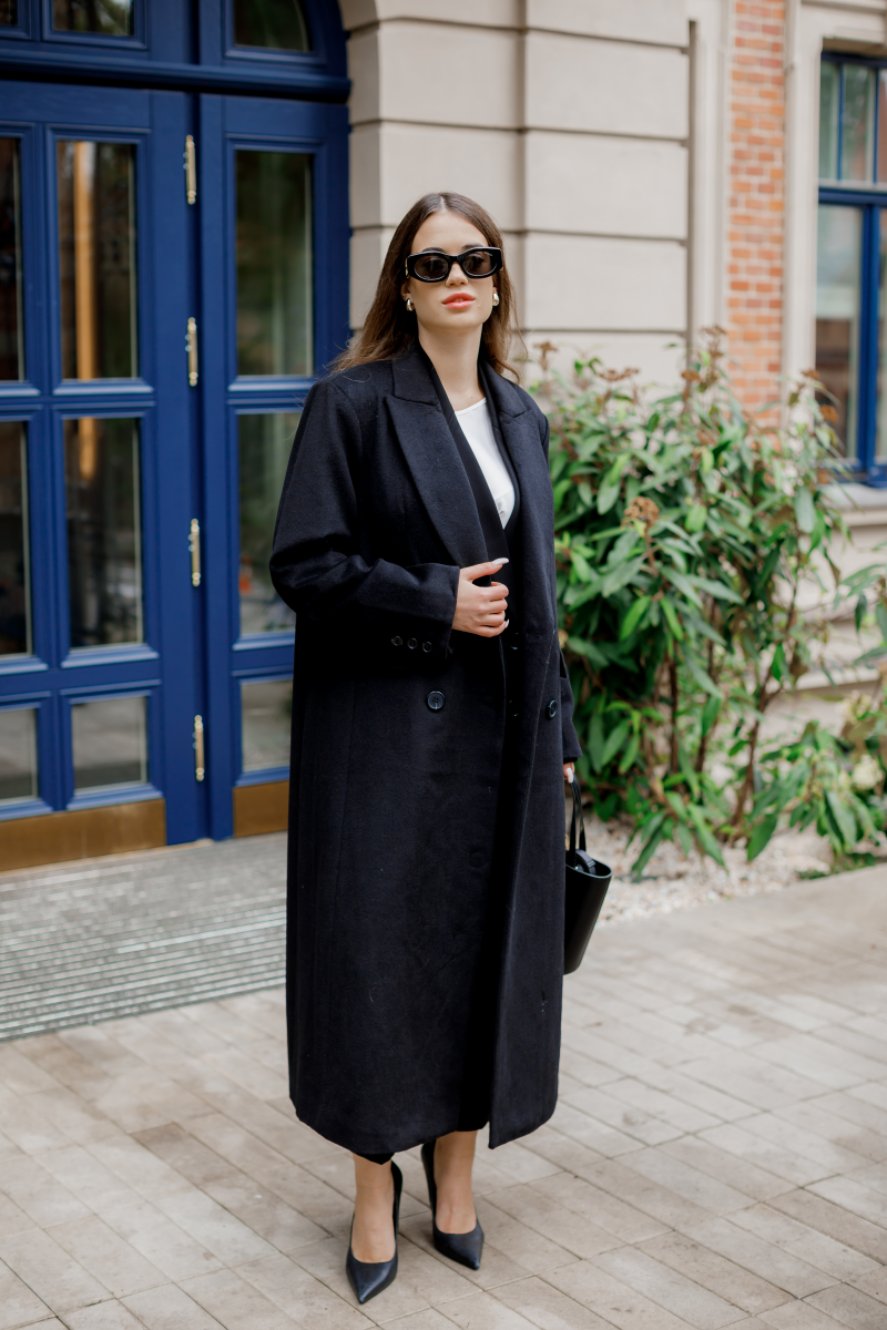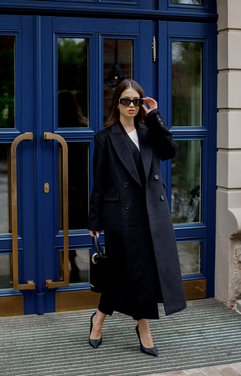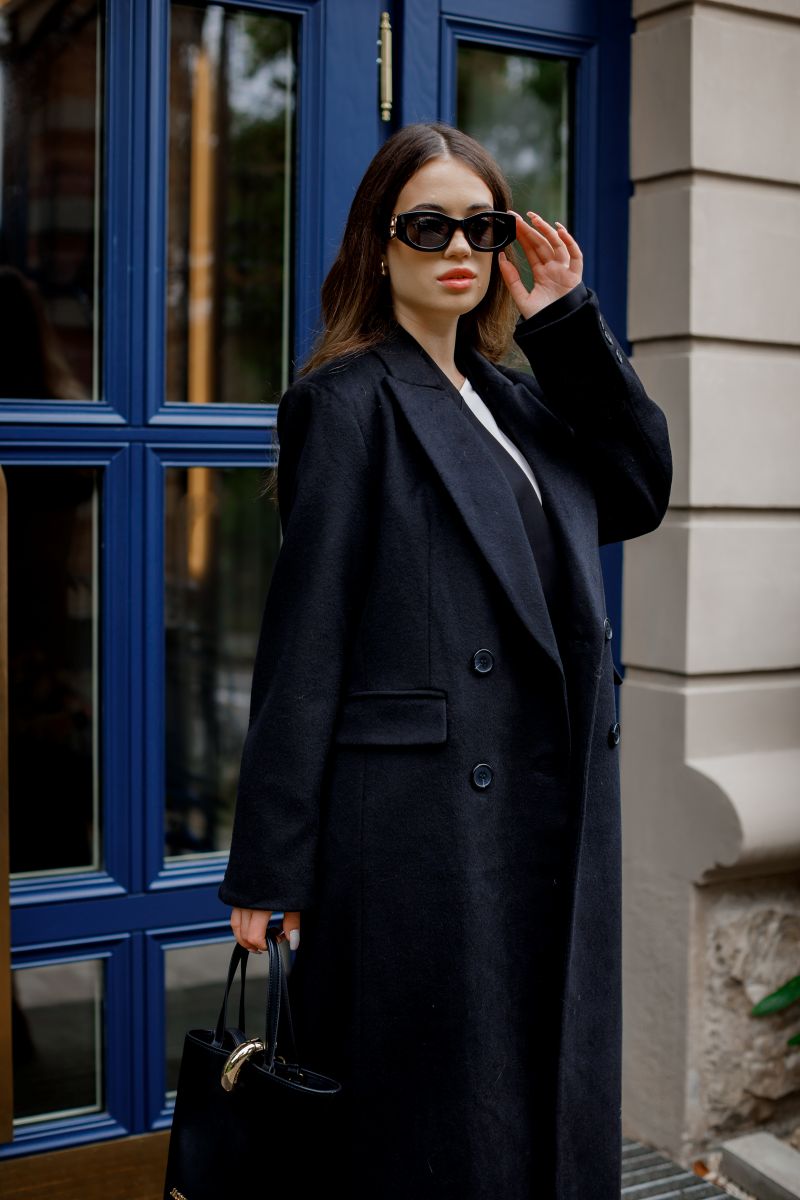 Пальто довжини міді з двобортною застібкою на гудзики, довгими рукавами та лацканами класичної форми. Модель має прямий крій, що підходить для будь-якого типу фігури. Вшиті бокові кишені додають практичності. Пальто створює елегантний та впевнений образ, доречний як у діловому, так і у повсякденному стилі.